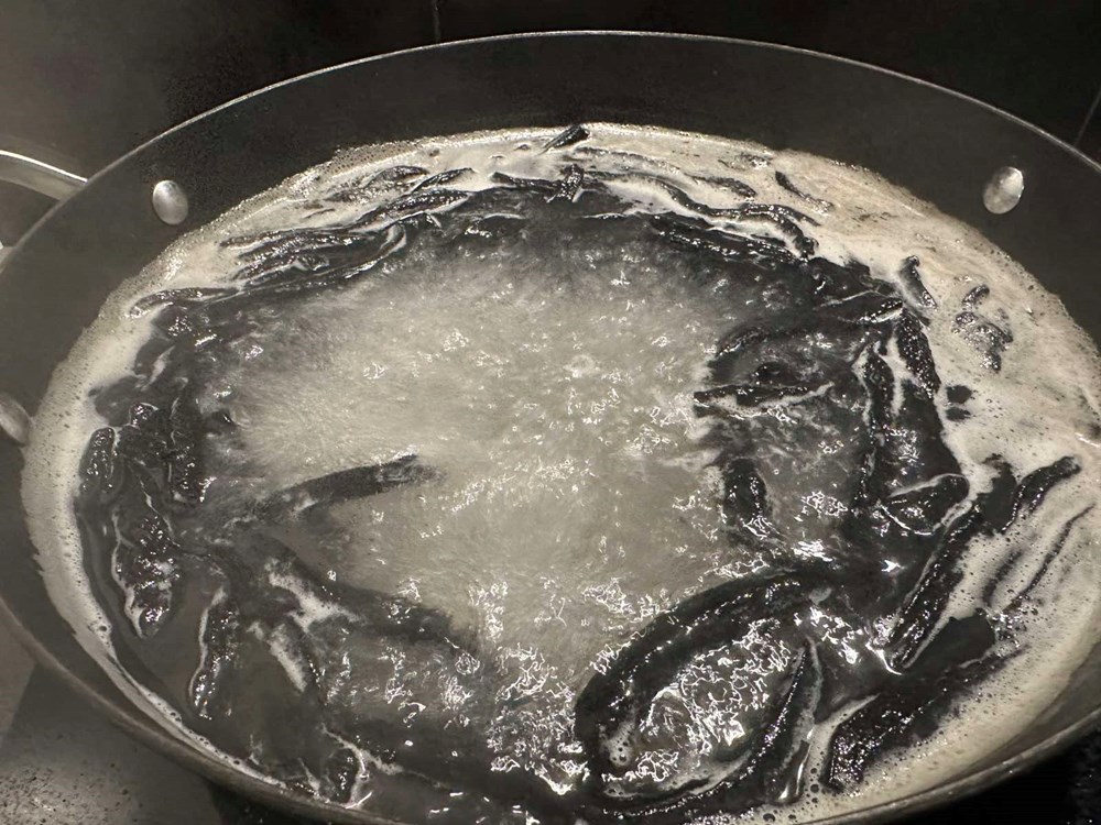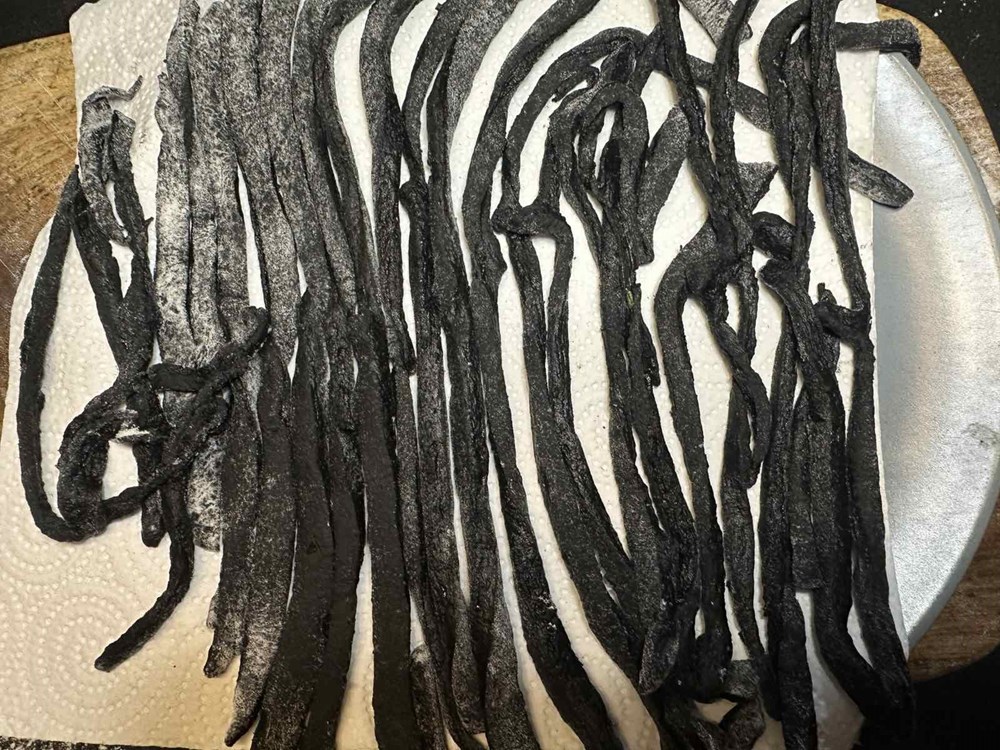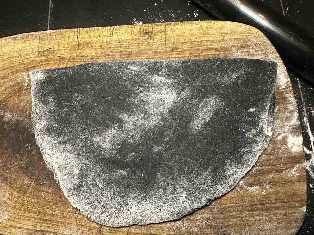 Razvucite zatim to tijesto na kuhinjskoj dasci kuhinjskim valjkom , te ju oštrim nožem narežite na rezance. Nadam se da niste bacili onu vodu u loncu u kojoj ste kuhali krumpir, ona kao i lonac će Vam sada zatrebati. Dakle, zagrijte vodu u loncu i dodajte po potrebi još koji dec vode ako treba - nek lonac bude cca 60 do 70 % napunjen vodom. Kad voda zakipi ubacite naše crne rezance. Nakon cca 7 minuta kada su rezanci zaplivali na površini lonca izvadite ih iz te vode u kojoj su se kuhali i isperite ih hladnom vodom.