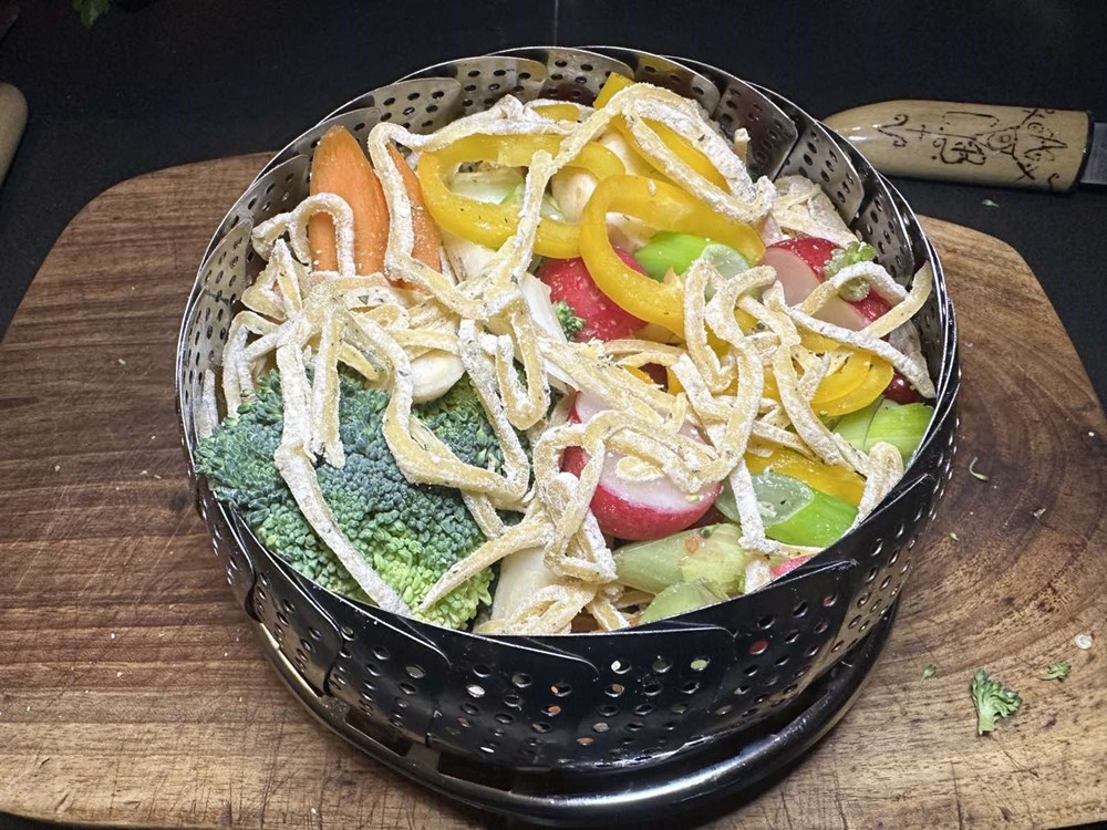 U jednu metalnu okruglu šupljikavu posudu ili neko veliko metalno sito ili cijedilo stavite cherry pomidor razrezan po pola, brokulu, papriku razrezanu na kolutiće, rotkvicu razrezanu po pola, mrkvu, korijen peršina i mladi luk razrezan na kolitiće, glavicu ljutike razrezanu na polovice i naše domaće rezance koji su 40-ak minuta odstajali na sobnoj temperaturi. Sve ovo zajedno rukom u šupljikavoj zdjeli dobro, ali lagano (da se rezanci ne bi oštetili ) promiješajte, pa stavite na lonac s kipućom vodom (u ovu vodu nemojte nikako stavljati niti sol niti ulje, kasnije ćete shvatiti zašto). Para od kipuće vode u loncu koji se nalazi na srednje jakoj vatri prolazit će kroz povrće i rezance i tako ih kuhati na pari.