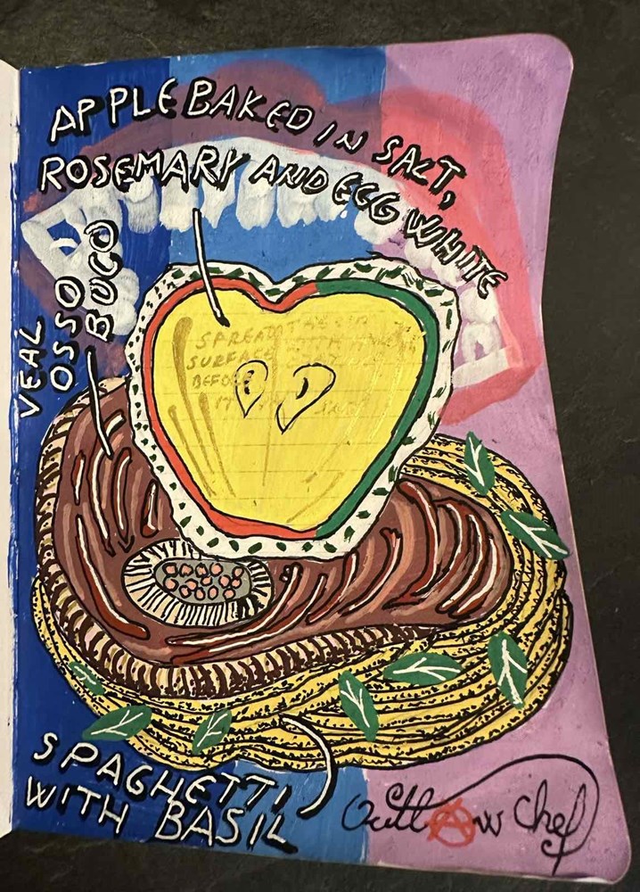 Nakon što sam im servirao doručak sjeo sam za stol i otvorio svoj "Art Brut Cuisine" sketchbook i počeo škrabati po papiru i analizirati unutar svojeg uma… Dakle, ako s jedne strane imam jabuku, a s druge hrpu soli… Kako to spojiti… To nije sasvim neizvedivo…Ljudi tako peku ribu u soli, pa bih ja mogao i jabuku…
