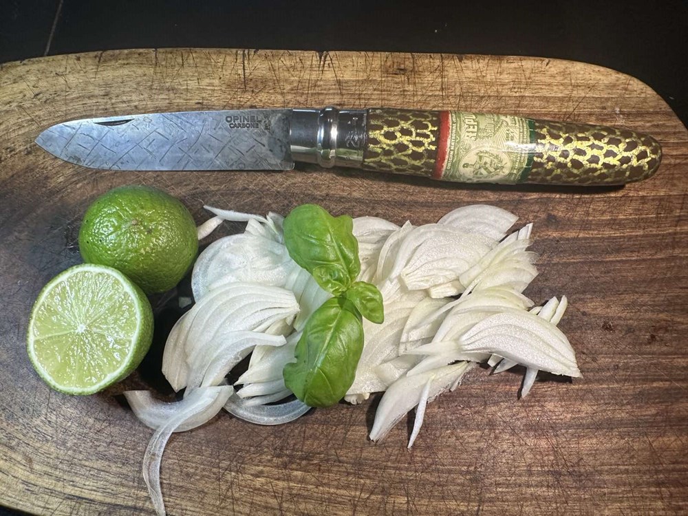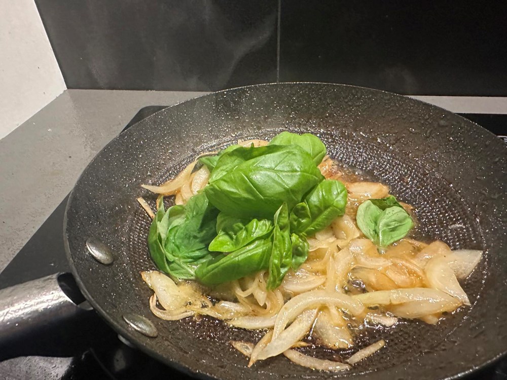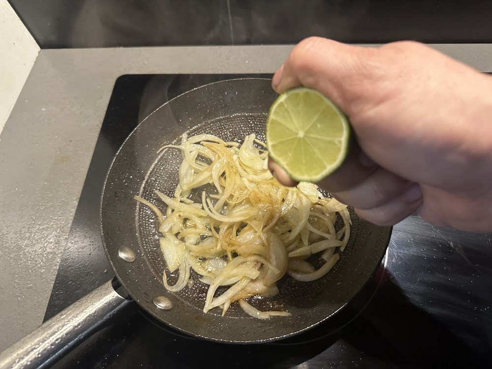 Sad zagrijte na srednje jakoj vatri onu tavu sa sokovima koji je pustio osso bucco na maslinovu ulju pa unutra ubacite pola glavice luka narezanu na tanke kolutiće. Kad luk poprimi blago smećkasti izgled, dodajte sok od pola limete. Kad taj sok zakipi, dodajte desetak listova svježeg bosiljka i maknite tavu s izvora topline.