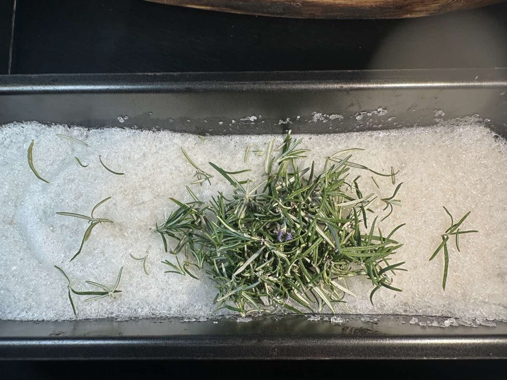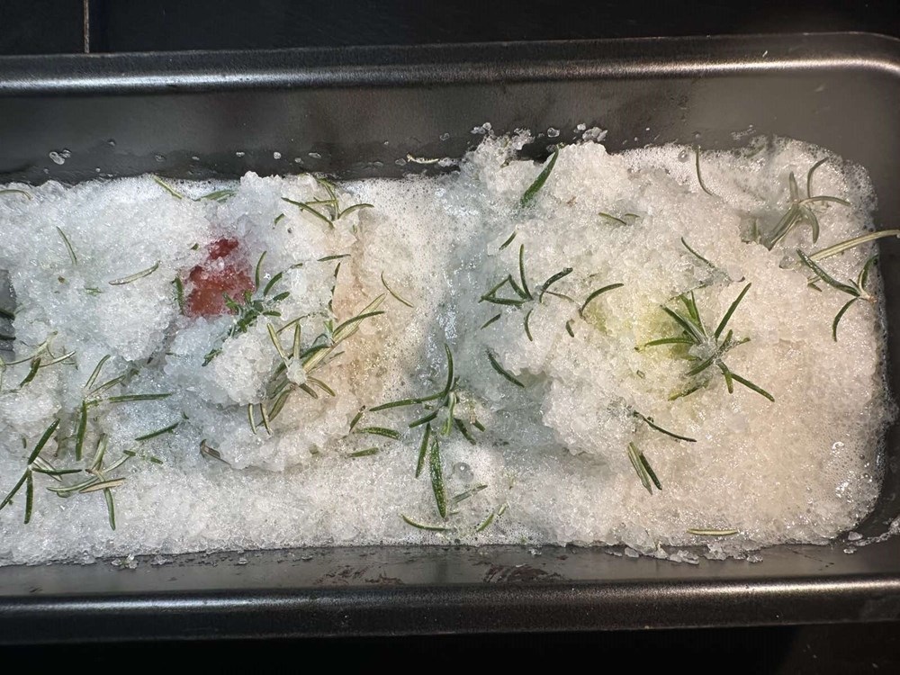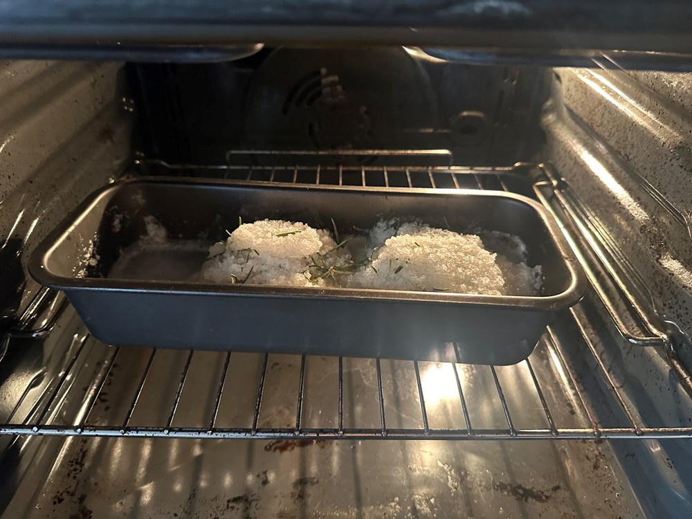 Izdvojite žumanjak od bjelanjka. Ako vam se iza kuće nalazi Tibet, žumanjak možete dati nekom tibetanskom svećeniku, trebat će mu energije dok radi u svojemu vrtu, mi ćemo zadržati bjelanjak za sebe. Bjelanjak "istucite" vilicom ili pjenjačom u nekoj manjoj zdjelici i dodajte malo vode cca 0,3 dcl pa pomiješajte zajedno s 2 kg krupne soli u zdjeli za pečenje i iglicama od 4 do 5 grančica ružmarina s ciljem da dobijete gustu i vlažnu smjesu.