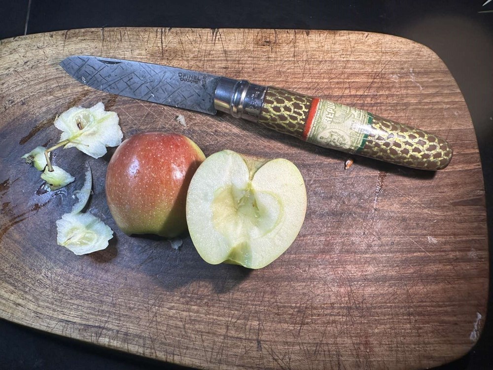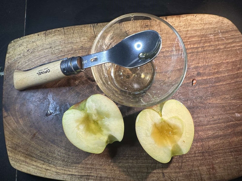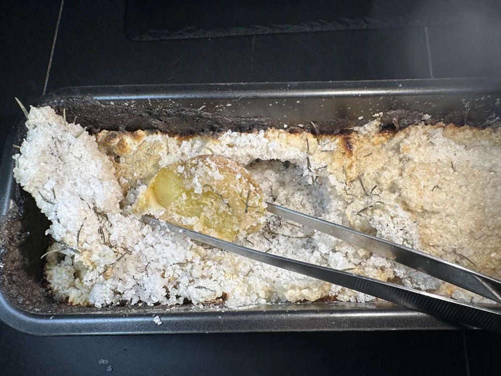 Dakle, uzmem jabuku razrežem ju na pola pa izvadim koščice… Onda ju namažem medom da sačuva dio svježine okusa koju će sol i temperatura izvući iz nje, a tu mogu još u smjesu soli i bjelanjka dodati iglice svježeg ružmarina jer se okus ružmarina savršeno uklapa s guštom jabuke, a i njegova jaka eterika čuvat će esencijalni okus meda u soli… Ako tako omotanu u sloj soli bjelanjka i ružmarina ispečem jabuku na 200 stupnjeva Celzijusa dobit ću koncentrat okusa na pol dehidrirane jabuke jer će sol izvući višak tekućine iz nje, a jabuka će imati jaki aromatizirani okus, što mi uz to paše…