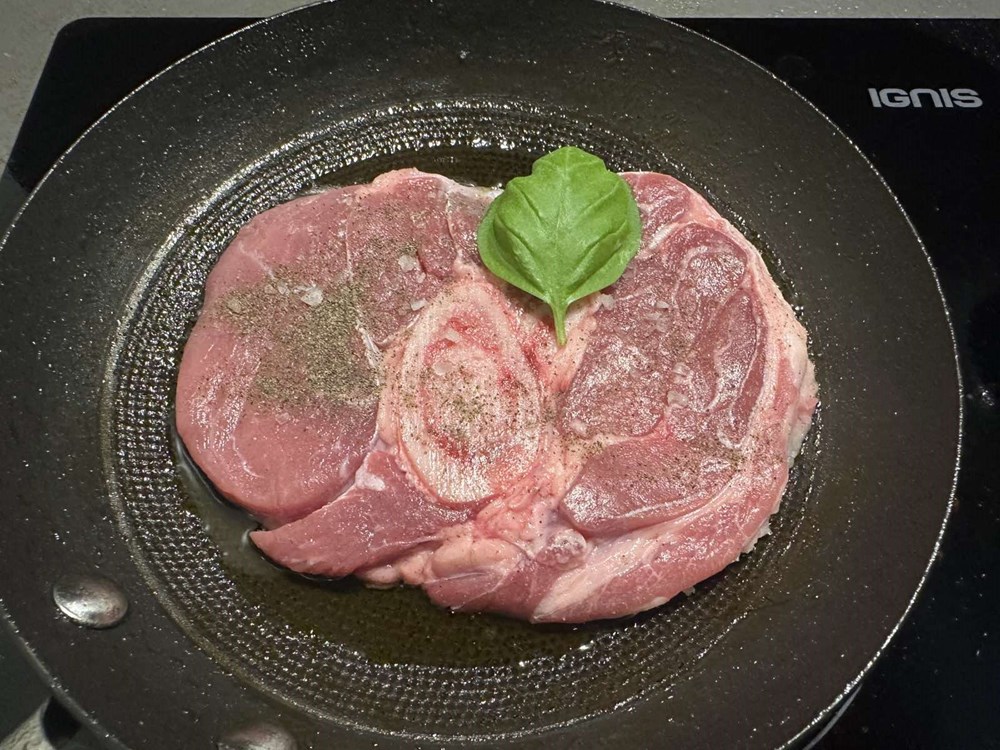 Na manjoj tavi i vrelom maslinovom ulju pecite cca 3 do 4 minute sa svake strane teleći osso bucco koji ste prethodno popaprili (prstohvat crnog friško mljevenog papra po svakoj strani) i vrlo malo posolili (pola prstohvata soli po svakoj strani). Kada meso dobije smećkasto-zlatne tonove, izvadite ga iz tave, a sok koji je pustilo ostavite u tavi, trebat će vam uskoro…