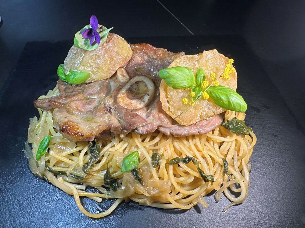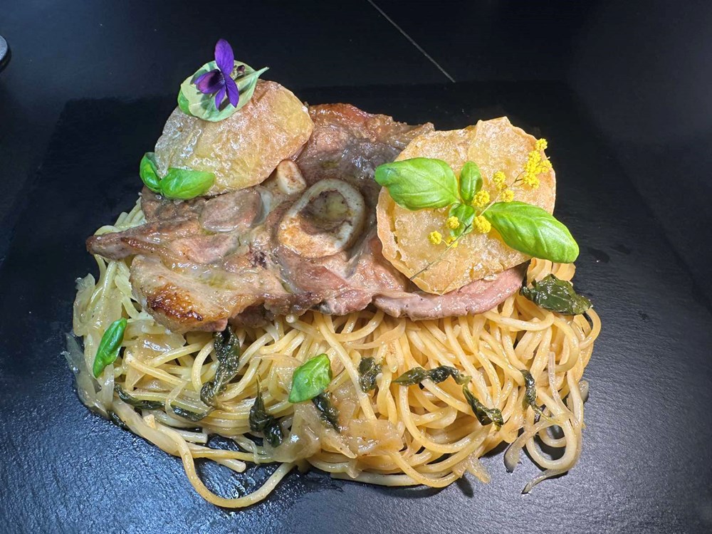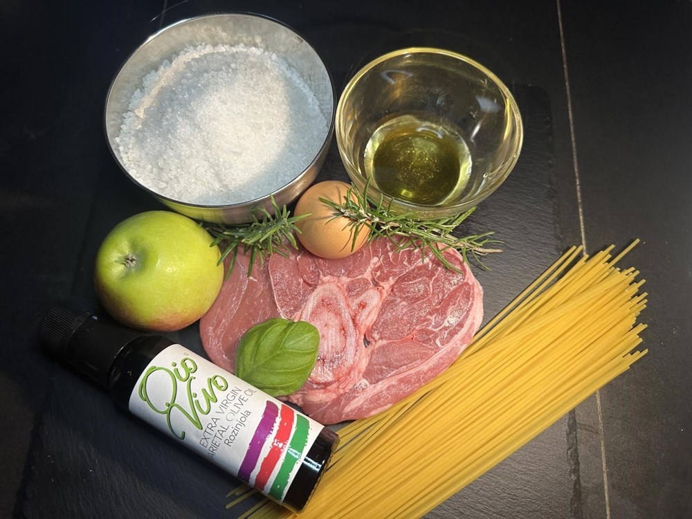 Jabuka u soli i ružmarinu na posteljici od telećeg osso bucca i špageta s bosiljkom