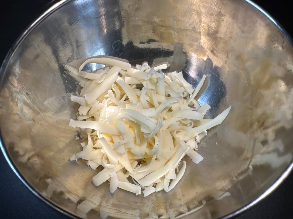 Stavite tako pripremljenu plošku krumpira na vrelo maslinovo ulje i pecite sa svake strane dok krumpir mjestimice ne posmeđi… to vam je u vremenu cca. 2,5 do 3 minute po svakoj strani. Kad krumpir okrenete na drugu stranu, na onu gornju stavite cca. 5 do 7 dkg gaude kojeg ste naribali… mada se glede tog sira izjasnim ljudskim normalnim načinom, a ne ovim "apotekarskim" - stavite prstohvat i pol naribanog sira (znat ćete da ga ima dovoljno na krumpiru kada gotovo prekrije površinu).