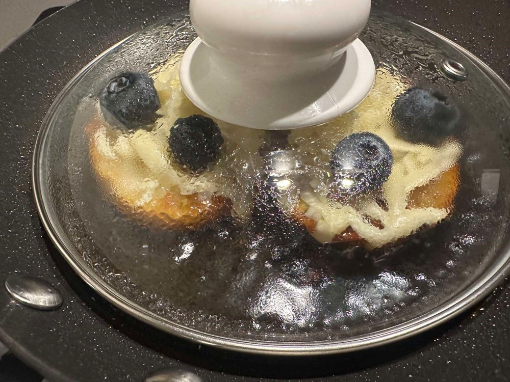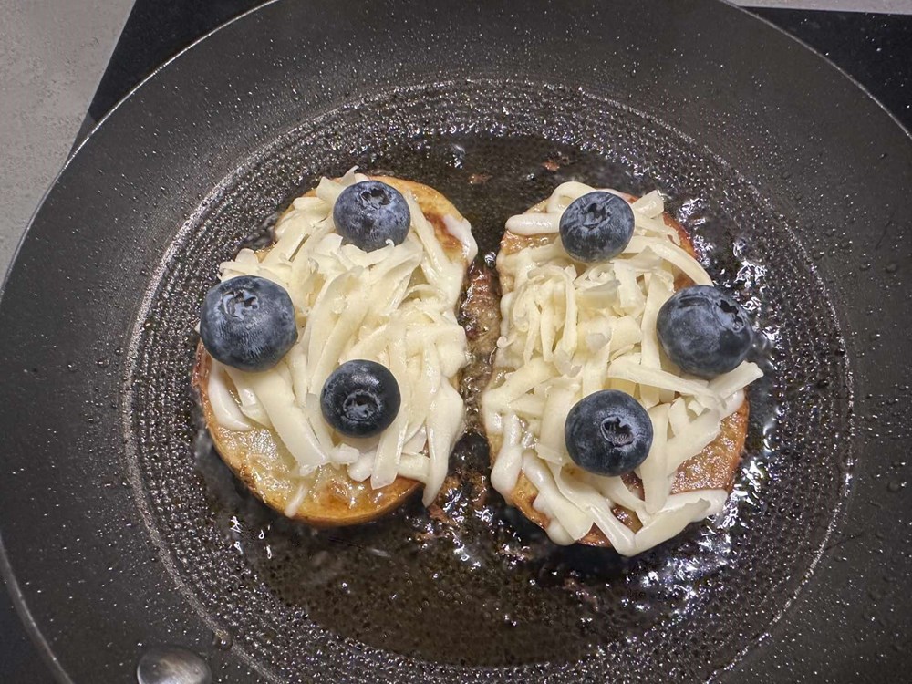 Na sir stavite nekoliko (3 do 5) bobica svježe borovnice, isključite izvor grijanja tave i poklopite manjim poklopcem na 40ak sekundi da se sir bolje otopi.