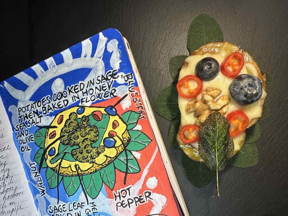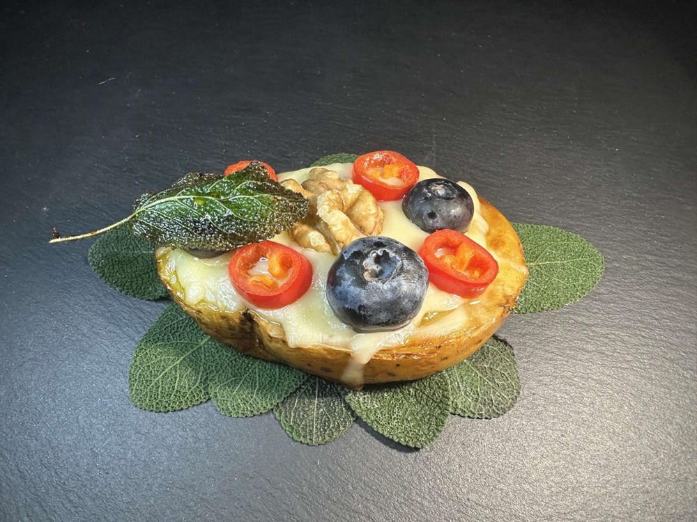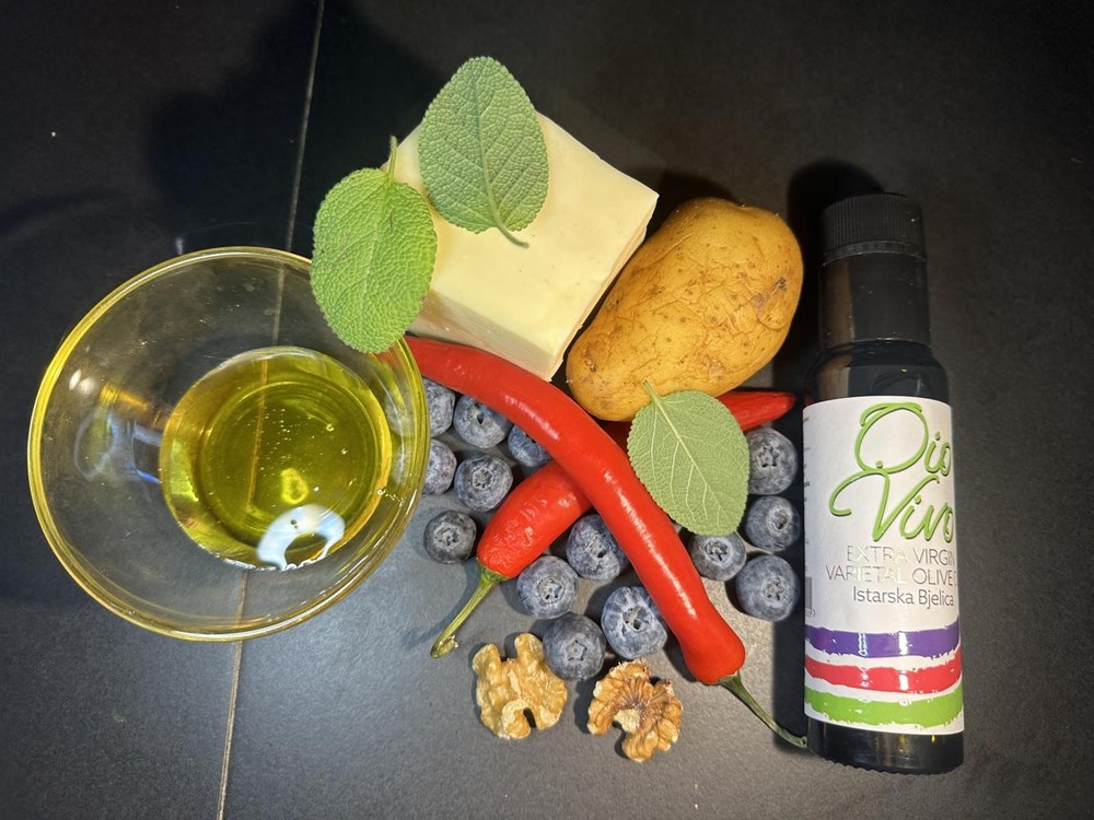 Na sredinu krumpira na gaudu postavite jezgru oraha , a okolo borovnica postavite 3 do pet tanko narezanih ploški sviježeg crvenog ljutog feferona. Na veš krumpira i sa strane stavite listove kadulje koje ste pržili u maslinovom ulju, medu i cvijetu morske soli (oni su sada hrskavi, a njihova blaga slankasto, gorkasto-slatka eterika spremna je sljubiti okuse borovnice, ljutinu feferona i blage slankasto-slatke struje okusa koji se sad nalazi u krumpiru).