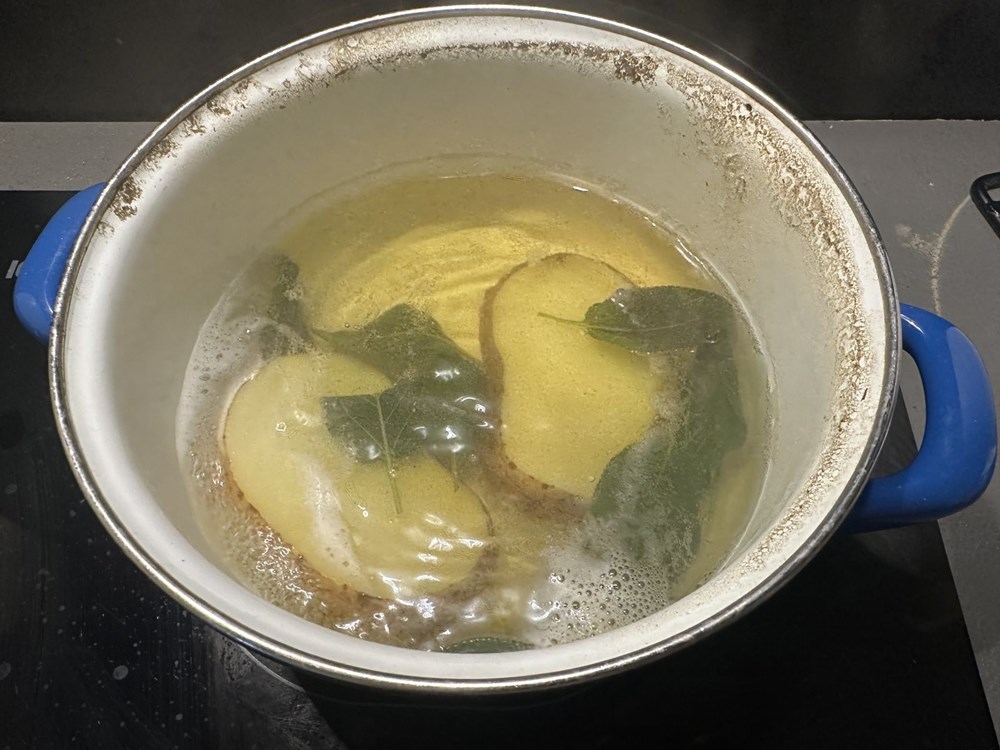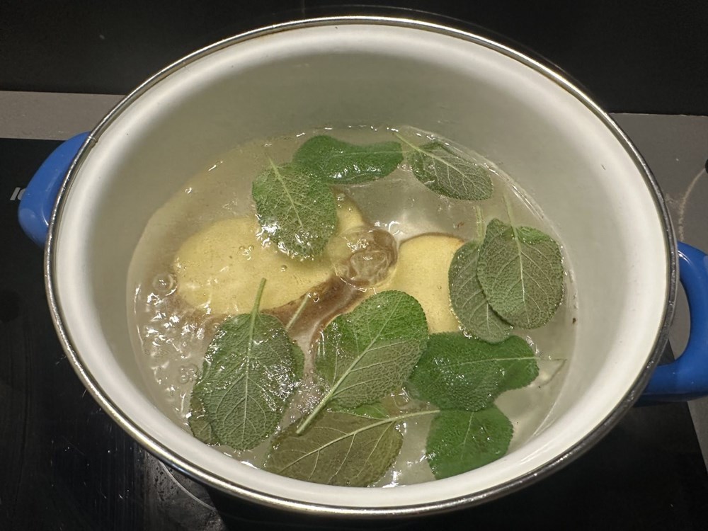 Dobivene fete krumpira zatim stavite u manji lonac u kipuću slanu vodu i dodajte unutra 8 do 9 svježih listova kadulje (ako nemate svježih mogu i oni sušeni). Kuhajte tako desetak minuta, pa fetu krumpira izvadite iz vode i pustite nekih pet do sedam minuta na manjem tanjuriću na papirnatom ubrusu da upije višak vode i da se malo ohladi.