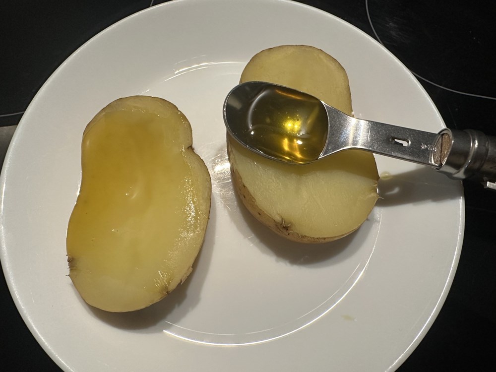 Nakon što namažete medom obje plohe krumpira, svaku stranu lagano posolite prstohvatom cvijeta morske soli.