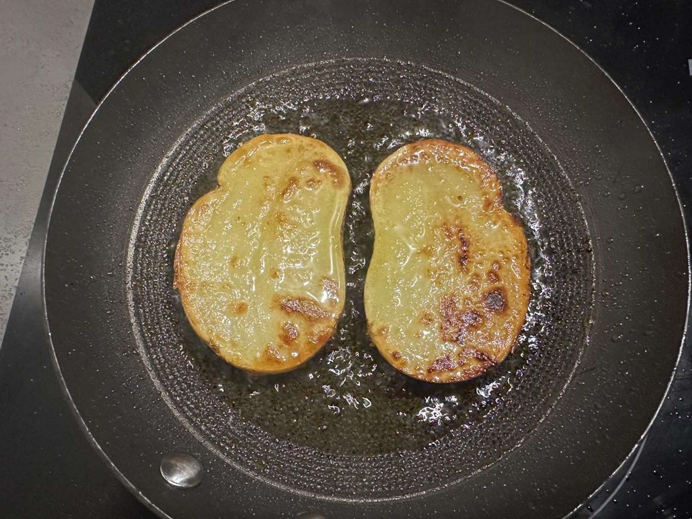 Nakon tih sedam minuta, stavite manju tavu na srednje jaku vatru i u nju jušnu žlicu maslinovog ulja. Dok se ulje u tavi grije maknite papirnati ubrus ispod ploške krumpira pa obje (gornju i donju) polovicu krumpira namažite livadnim medom.