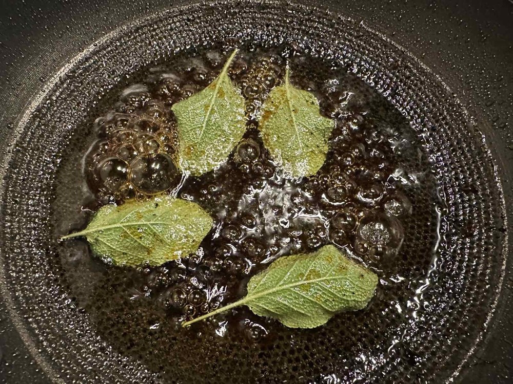 Čim ste stavili krumpir na ubrus, ponovo upalite izvor grijanja, a tavu u kojoj ste pekli krumpir stavite na srednje jaku vatru pa dodajte još pola jušne žlice ulja, jušnu žlicu meda i prstohvat cvijeta morske soli i sve dobro pomiješajte… Za petnaestak sekundi toplina bi trebala sve rastopiti da se dobije kompaktna polugusta tekućina u koju ubacite nekoliko listova svježe kadulje.