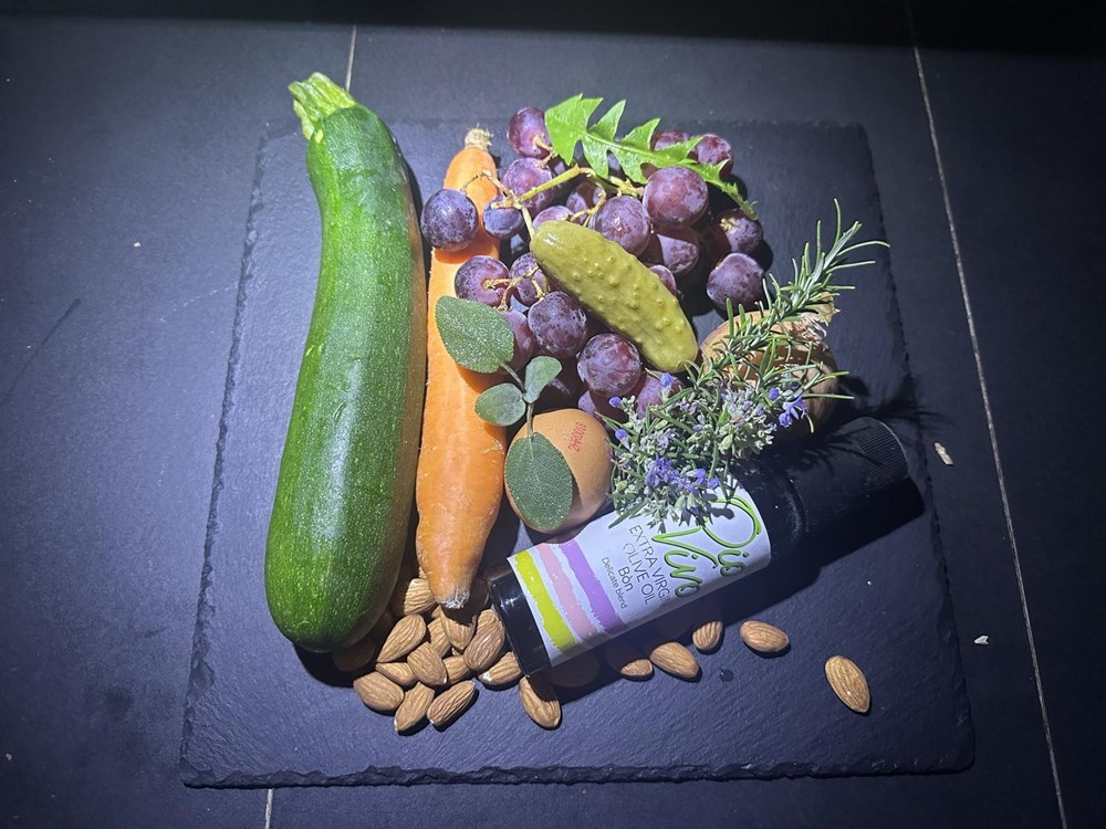 Zatim po tom grožđu stavite smjesu naribane mrkve, peršina, listova maslačka u koju ste stavili jušnu žlicu maslinovog ulja u kojemu ste pekli grožđe, sok mandarine, papar i sol i sve dobro izmiješali. Po toj gustoj smjesi mrkve, mandarine, peršina i lista maslačka poredajte tikvicu prženu na maslinovu ulju. Po tikvici poredajte kiseli krastavac na fete.