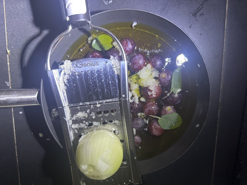 U manjoj metalnoj tavi ili zdjelici za pečenje stavite bobice crnog stolnog grožđa pa prelijte s cca. 1,5 dcl maslinovog ulja, ubacite unutra svježe listove kadulje, prstohvat cvijeta morske soli, pa preko svega naribajte na ribež na sitno pola glavice luka.