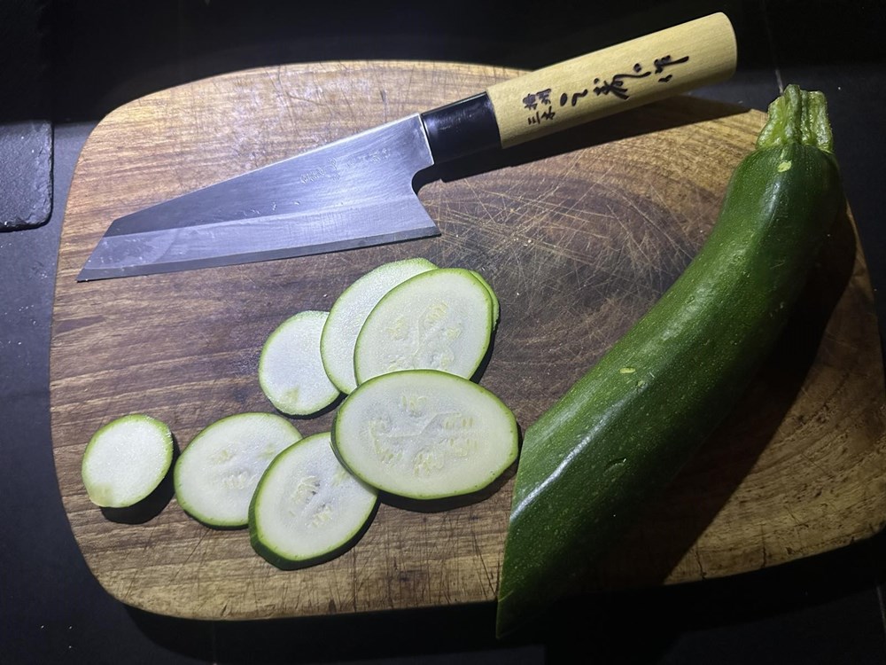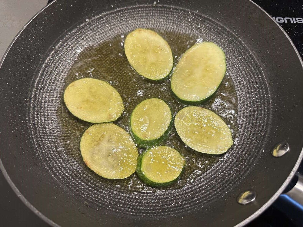 Tikvicu izrežite na kolutiće pa ju par minuta sa svake strane pržite na maslinovu ulju.