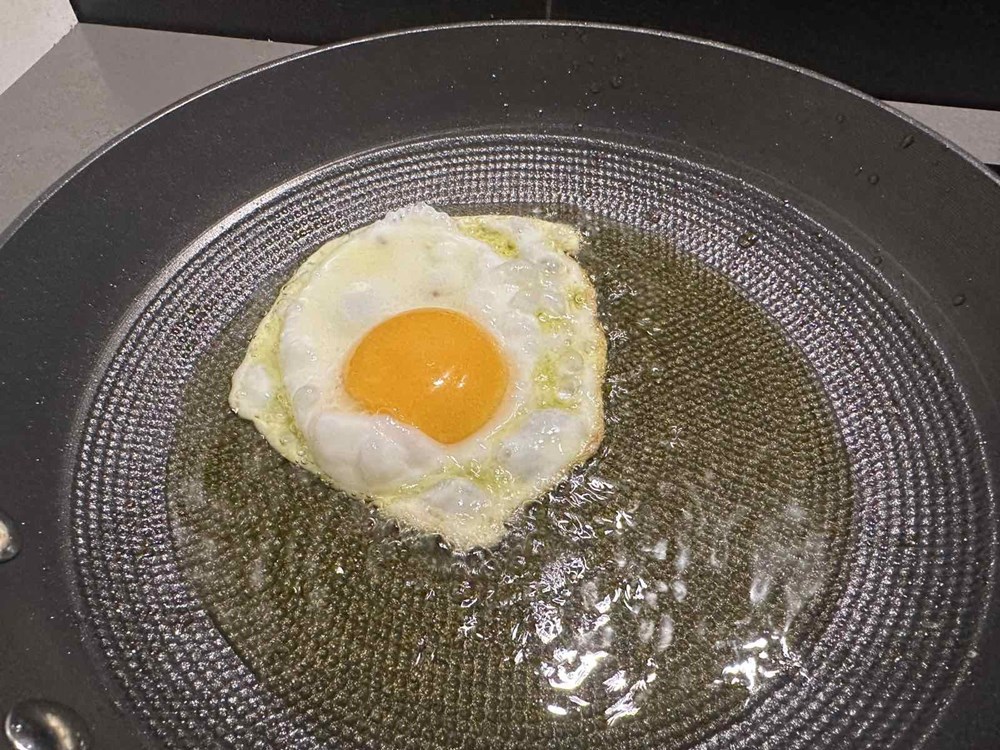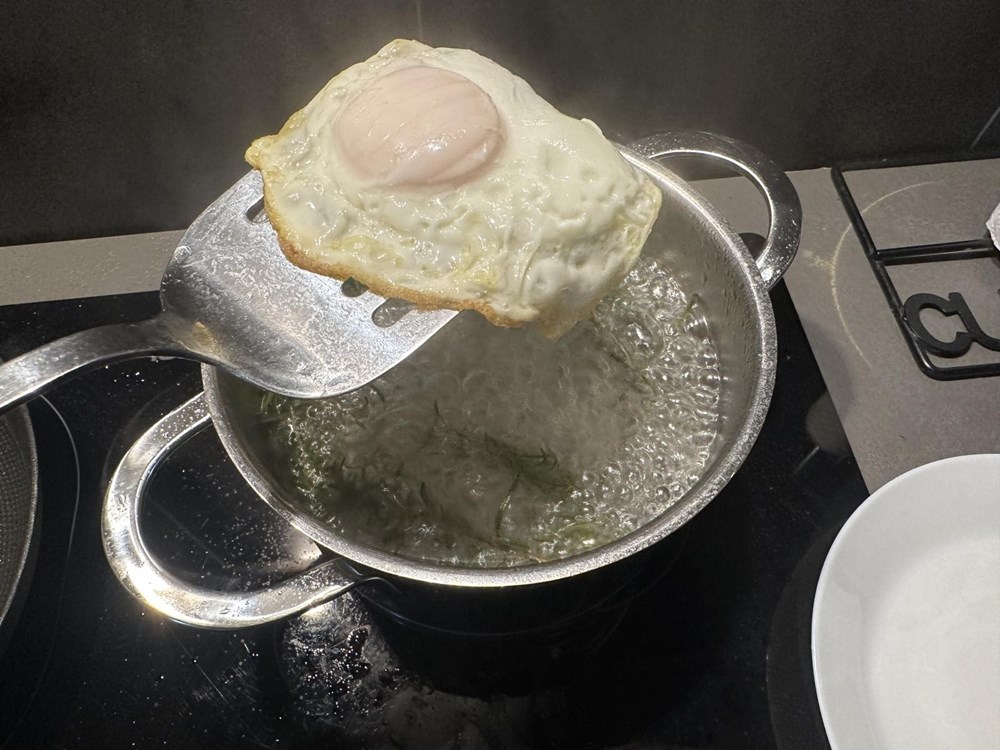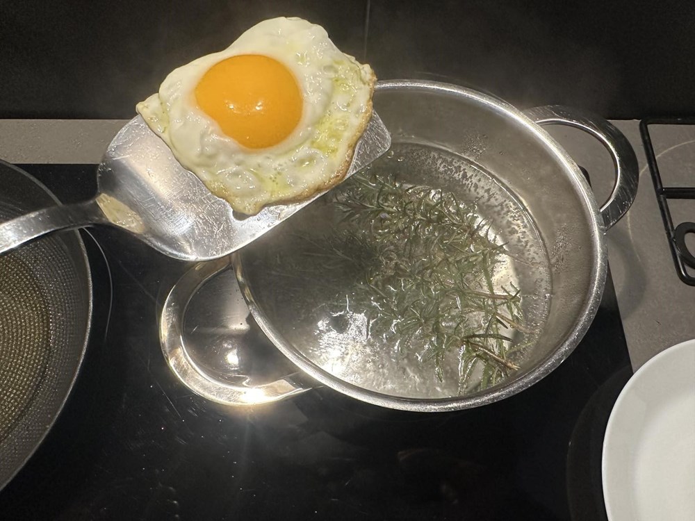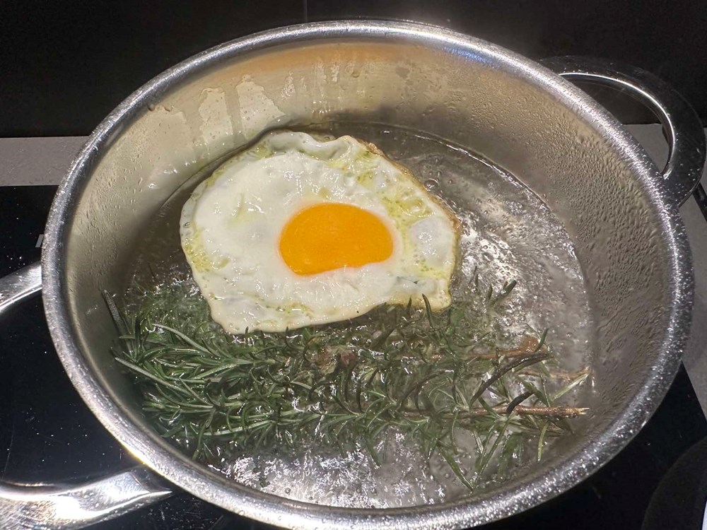Na zagrijanom maslinovom ulju na srednje jakoj vatri u plitkoj tavi pecite jaje na oko. Kada donji dio pobijeli i lagano očvrsne, a dok je gornji dio još uvijek lagano sluzav, širom špatulom prebacite naše jaje iz tave u manji lonac s kipućom slanom vodom, jušnom žličicom jabučnog octa i tri ružmarinove grančice.