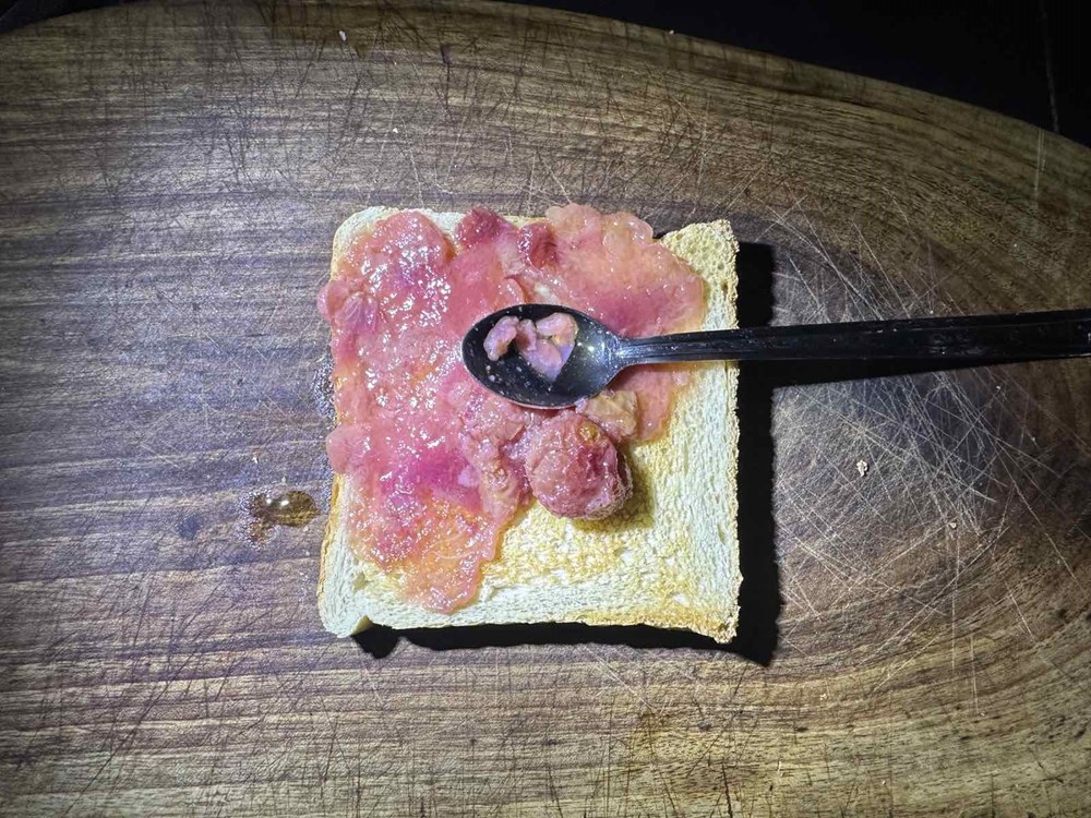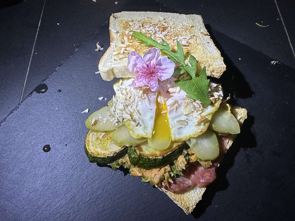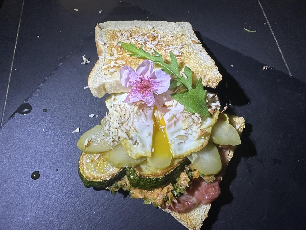 Nakon 30 do 40 sekundi izvadite jaje iz kipuće vode na ravan tanjur na koji ste stavili kuhinjski papirnati ubrus da se upije višak tekućine. Istostirajte dvije fete kruha. Na donju fetu prije stavite nekoliko bobica grožđa kojeg ste zapekli u pećnici u maslinovom ulju, kadulji i naribanom luku, pa ih čajnom žličicom zgnječite i razmažite po tostiranom kruhu.