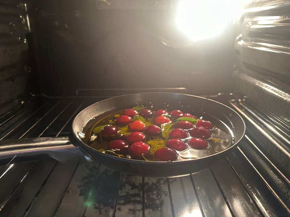Sve ovo u manjoj metalnoj tavi ili zdjelici za pečenje stavite u zagrijanu pećnicu na 175 stupnjeva Celzijusa na 15 minuta, pa izvadite zdijelu iz pećnice.