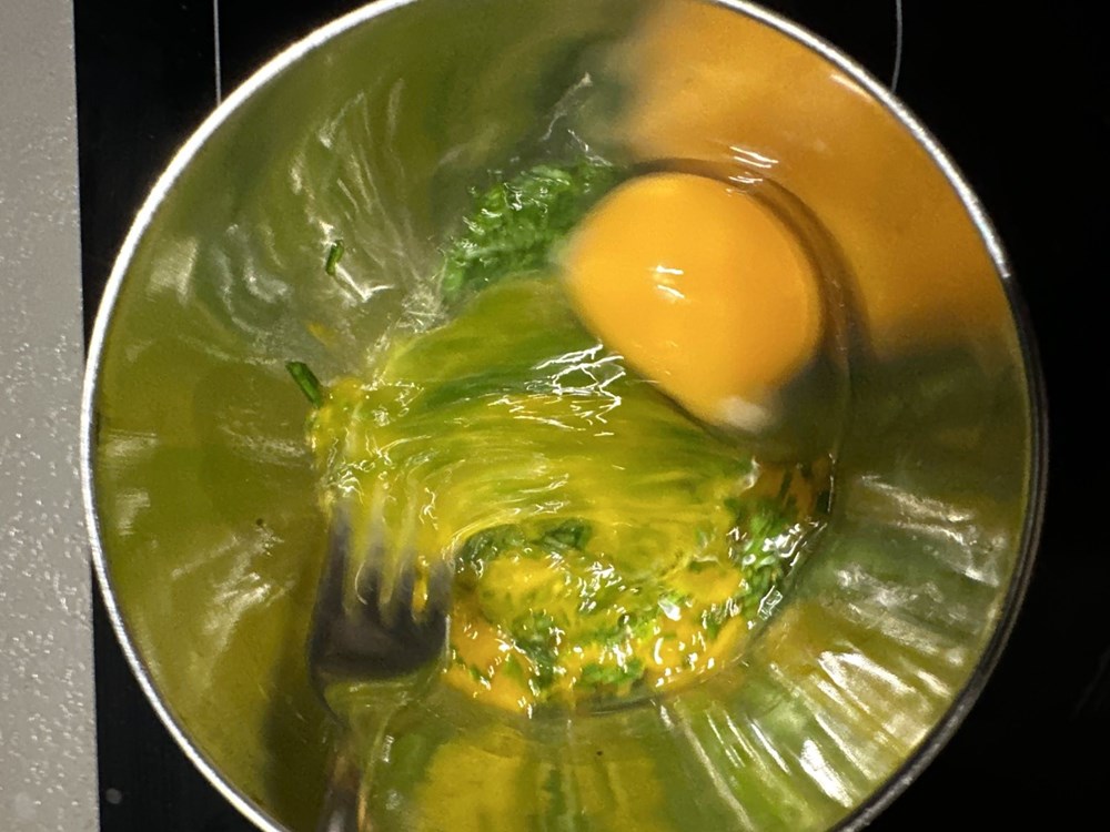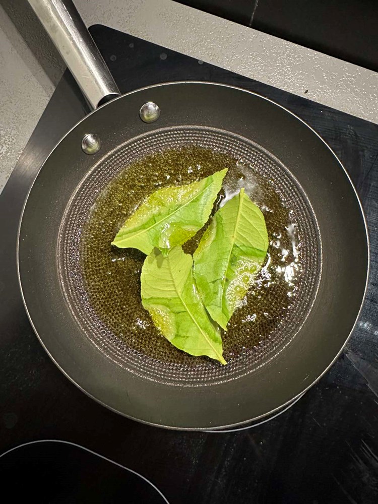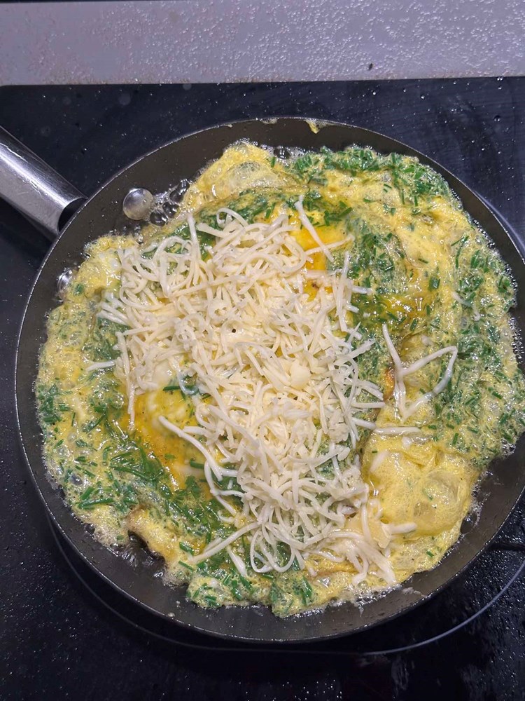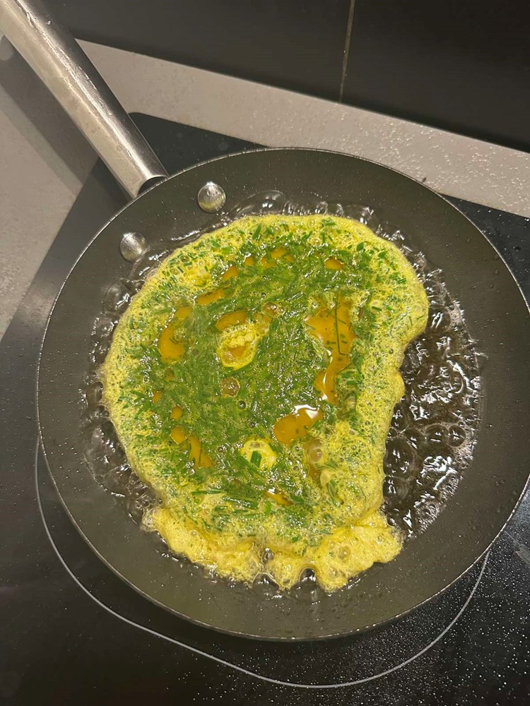 Na srednje jakoj vatri, na zagrijanom maslinovom ulju pržite tri limunova lista tridesetak sekundi da aromatizirate ulje. Nakon toga izvadite listove iz tave, pa u tavu stavite jaja i sitno nasjeckani luk vlasac kojeg ste prethodno usitnili pa izmutili s jajima.