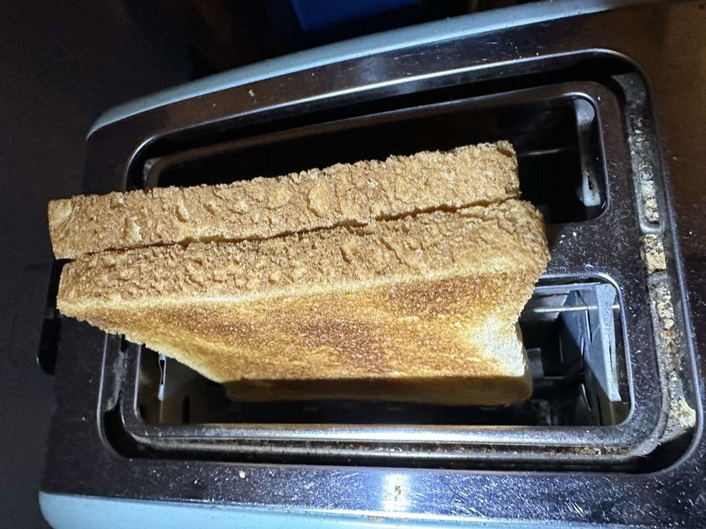 Sada razrežite oštrim nazubljenim nožem tost na pola tako da dobijete dva trokuta. Naslonite dobivene trokute jedan na drugi pa preko njih bacite preostalih 2, 3 dkg gaude.