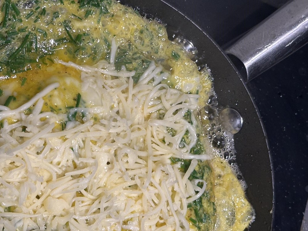 Nakon još nekih trideset do četrdeset sekundi prženja, preklopite omlet na pola pa ga ostavite 10-ak sekundi na papirnatom ubrusu na ravnome tanjuru (da upije višak ulja).