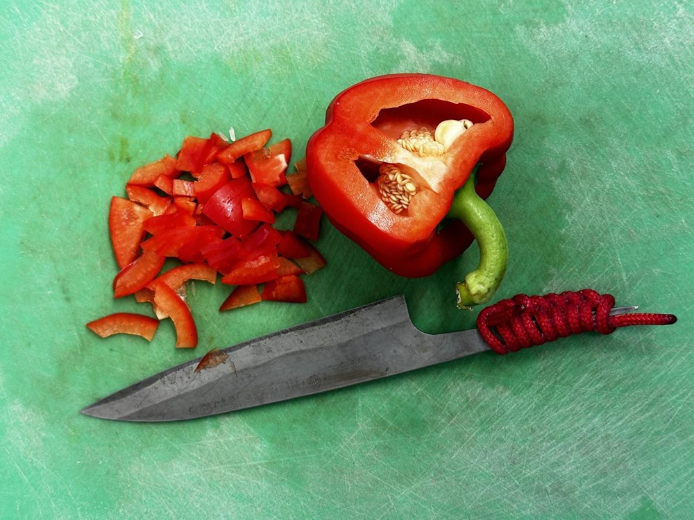 Oštrim kuhinjskim nožem izrežite na tanke trakice pola crvene slatke paprike.