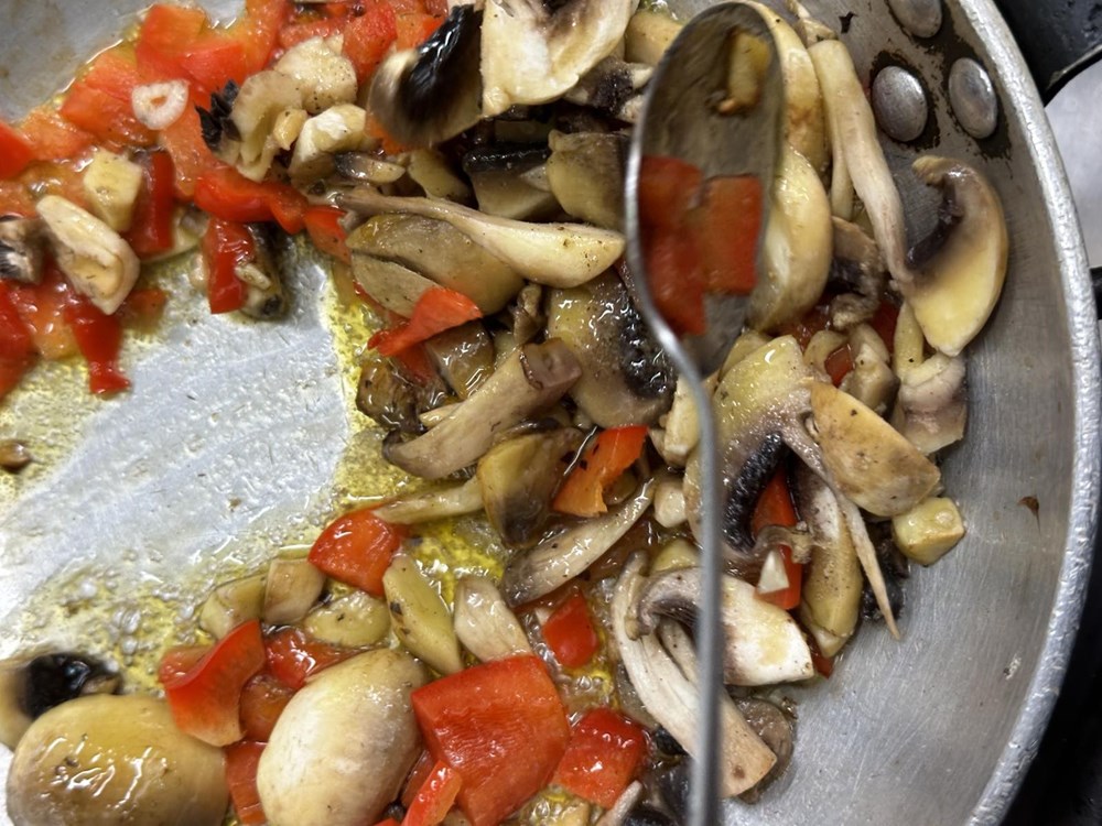 Na zagrijanim maslinovom ulju prvo stavite pržiti crvenu papriku i gljive.