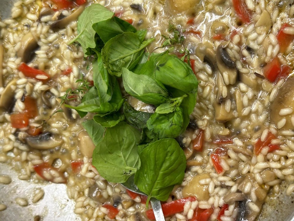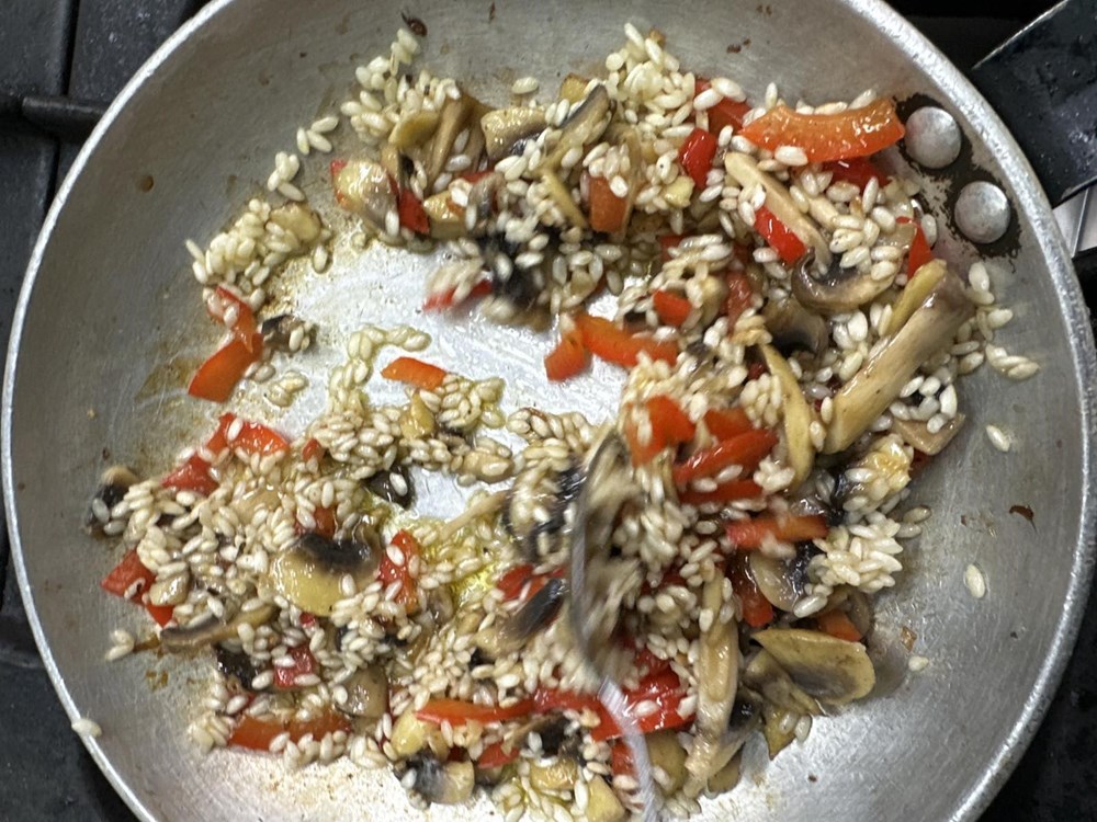 Miješajte tako rižu, gljive i papriku još otprilike tri minute sok se riža na istostira i postane staklenkasta.