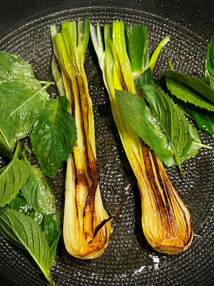 U tavi na vrelom maslinovom ulju istovremeno kada ste stavili kuhati krumpir stavite pržiti mladi luk razrezan uzduž na polovice. Pržite ga 30 do 40 sekundi sa svake strane. Kada okrenete luk na drugu stranu da se prži, ubacite sedam listova od svježe mente pa nakon 30 sekundi dodajte cca pola decilitra vode. Dinstajte tako luk još maksimalno 50 sekundi pa ga izvadite iz vode i osušite ga uz pomoć kuhinjskog papirnatog ubrusa (jednostavni pokrijete gornju i donju stranu luka papirnatim ubrusom i ostavite ga petnaestak sekundi da upije višak tekućine).
