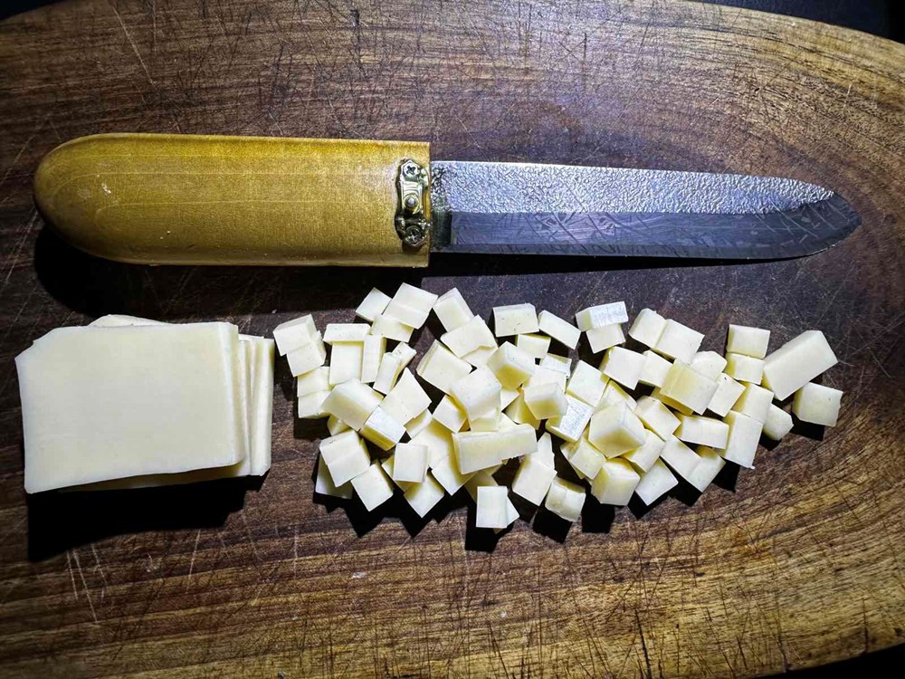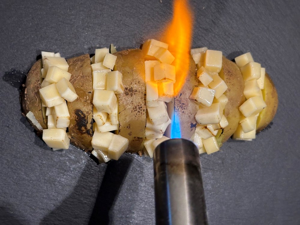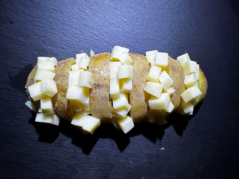 Polovicu kuhanog krumpira narežite na trakice pa ga posložite s razmacima nešto manjim od pola centimetara. U te razmake stavite kockice gauda sira koje ste narezali nožem da budu veličine graška (vidi forografiju). Zatim džepnim ili kuhinjskim brenerom otopite gaudu koja se nalazi između krumpira. Po topljenoj gaudi stavite sitno isjeckane listove kadulje. Na krumpir i topljenu gaudu stavite polovicu luka koju ste pržili pa onda izdinstali s listovima mente. Na tu polovicu luka stavite dekoracije radi vama omiljeni cvijet, pazite samo da je cvijet jestiv ili da nije otrovan (he, he, he … ) . I to je to… uživajte u blagim citrusnim okusima koje podiže lagana svježina mente a sljubljuje kombinacija topljene gaude i kuhanog krumpira… Živili i dobar tek.