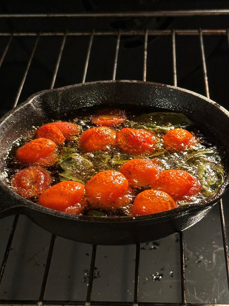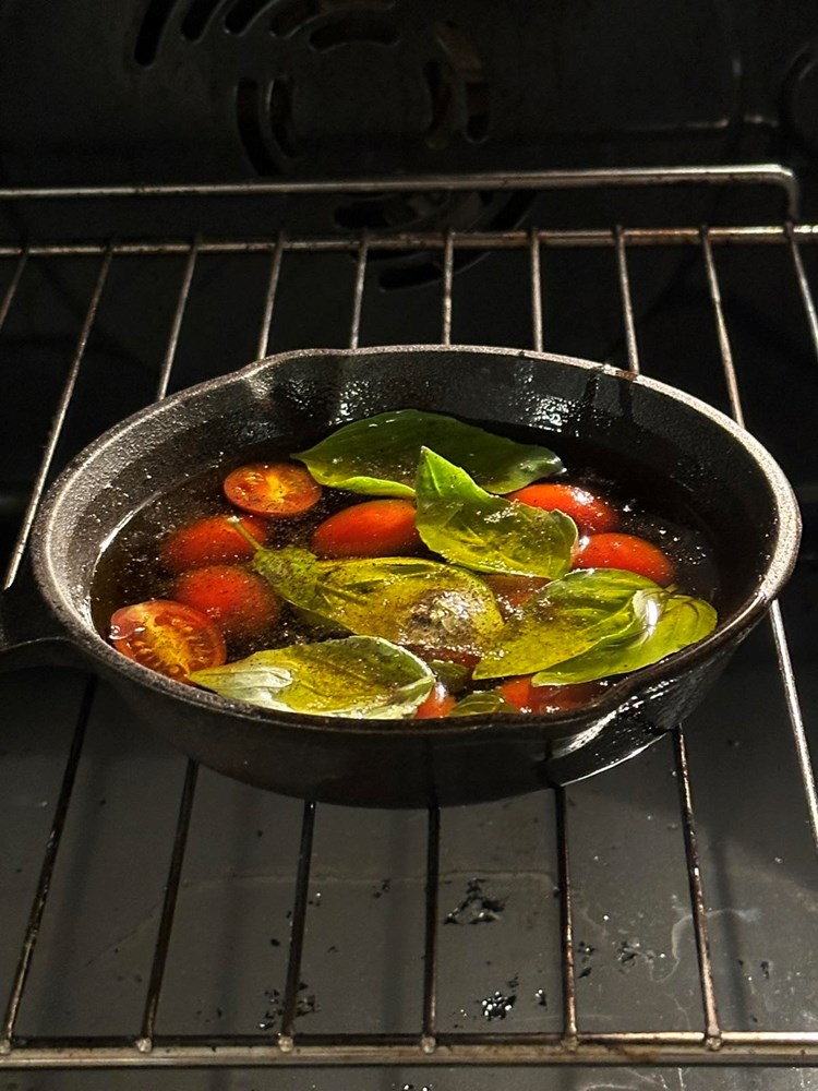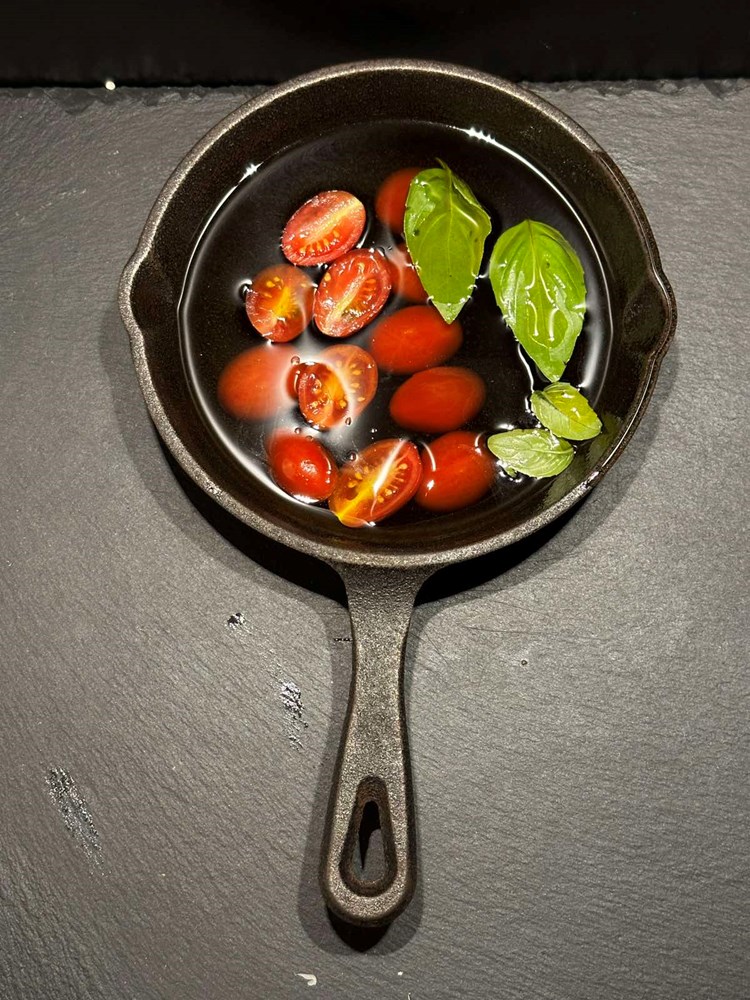 U malu tavu u prst maslinovog ulja stavite pet cherry pomidora razrezanih po pola , trećinu žličice cvijeta morske soli i trećinu žličice crnog friško mljevenog papra.