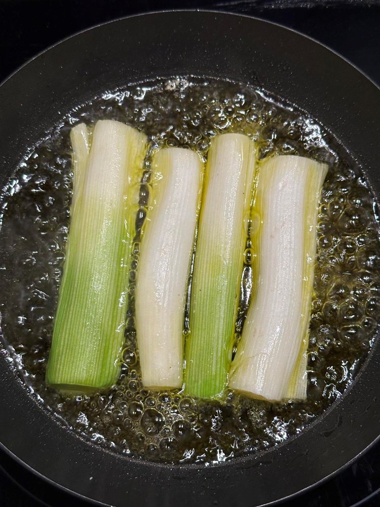Izrezane polovice poriluka pržite u dobro zagrijanom maslinovom ulju (cca 1,5 jušna žlica maslinovog ulja) u koje ste prethodno stavili i izmiješali pola jušne žlice meda, nešto manje od trećine čajne žličice cvijeta morske soli. Pržite tako nekih tri minute na srednje jakoj vatri pa dodajte listove svježe mente. Nakon dvije minute otkad ste ubacili mentu maknite s izvora topline.