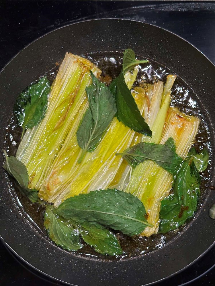 Na taj kupus poslažite polovice poriluka koje ste pržili u tavi na medu i menti.