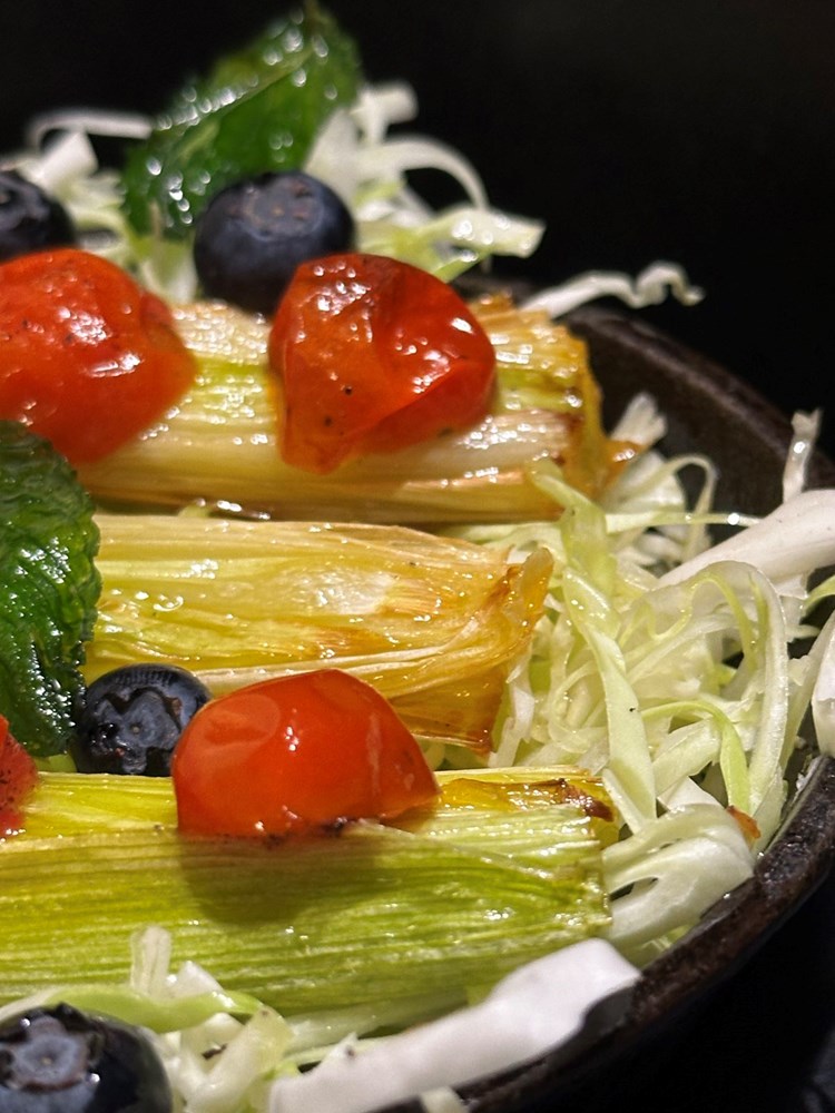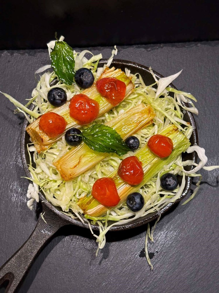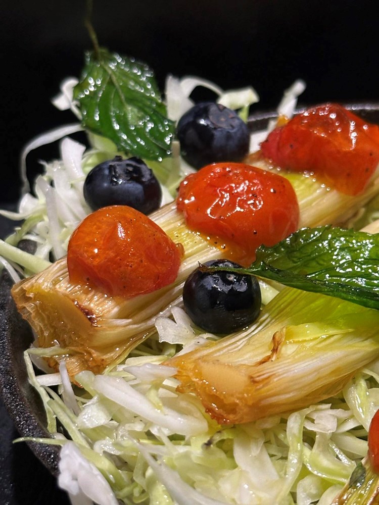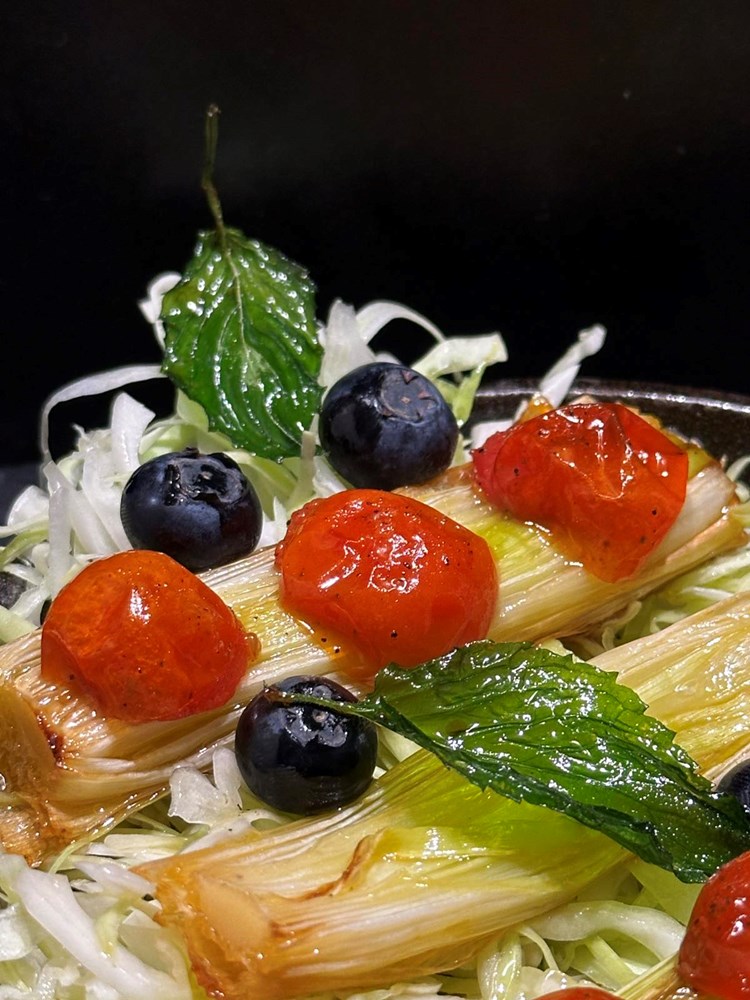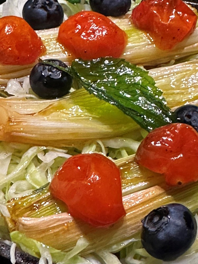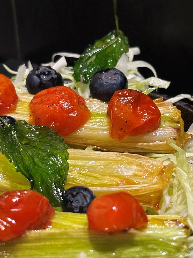 Po tim polovicama poriluka poslažite polovice cherry pomidora iz pećnice, između po kupusu "pobacajte" bobice svježe borovnice i ukrasite s dva - tri listića pržene mente.