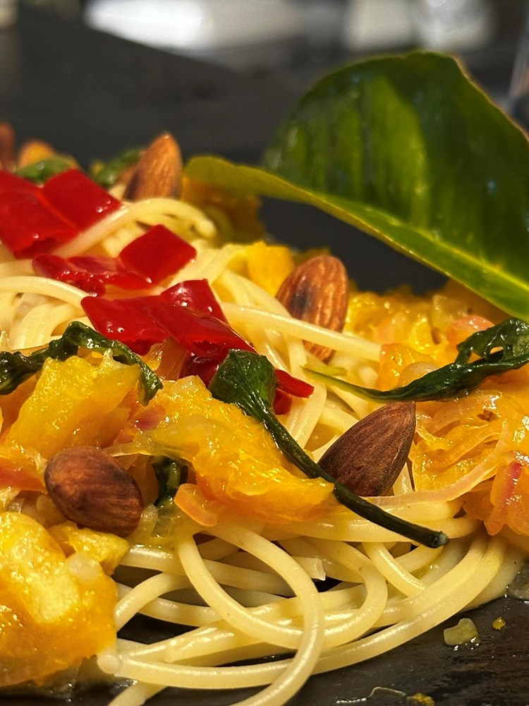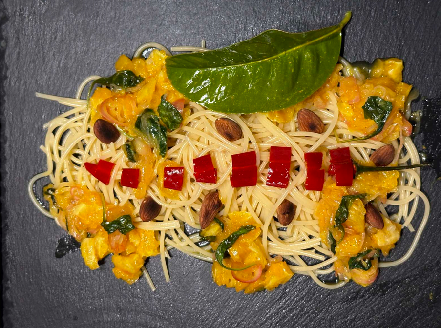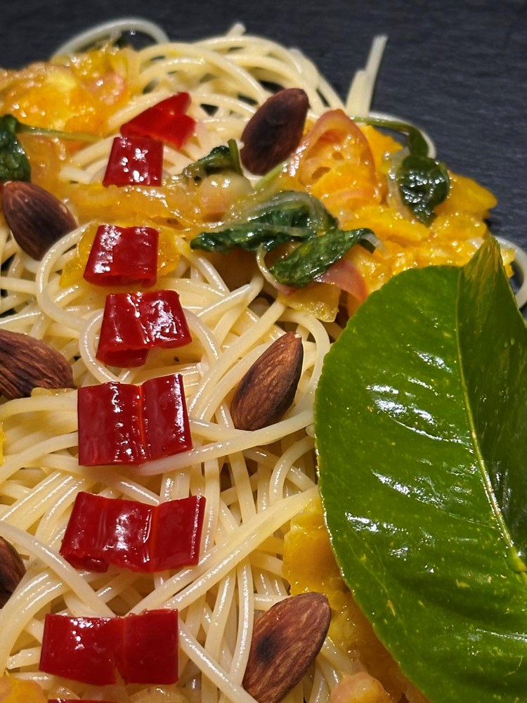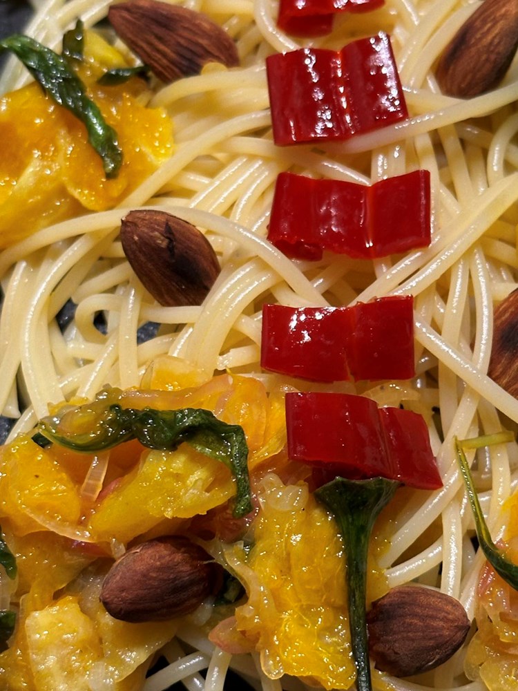 Prvo na dno velikog ravnog tanjura stavite veliku žlicu šalše od naranče pa onda na nju položite spaghette. Zatim po spaghettima mjestimice žlicom stavite još šalše od naranče. Sa lijeve i desne strane po spaghettima postavite tostirane bademe. Po sredini spaghetta postavite naš ljuti feferon koji je odstajao tri dana u maslinovom ulju i bosiljku pa ste ga onda narezali na trakice.