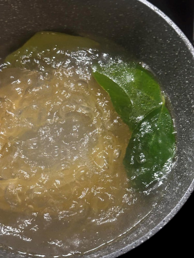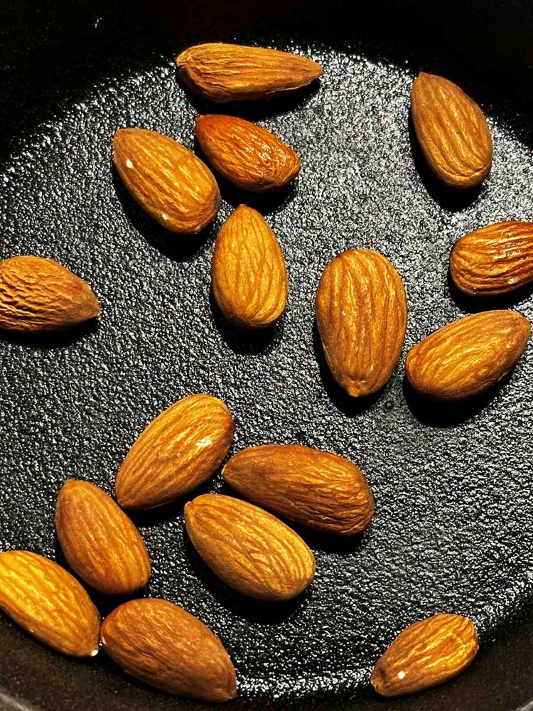 Na suhoj manjoj vrućoj tavi istostirajte na nekoliko minuta bademe. U loncu sa slanom vrelom vodom stavite kuhati spaghette, pet minuta prije kraja kuhanja dodajte 2-3 svježa limunova lista da puste preko vode blagu citrusnu aromu u spaghette.