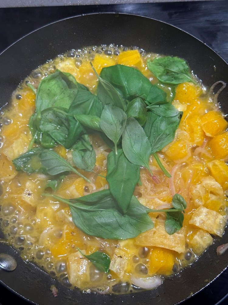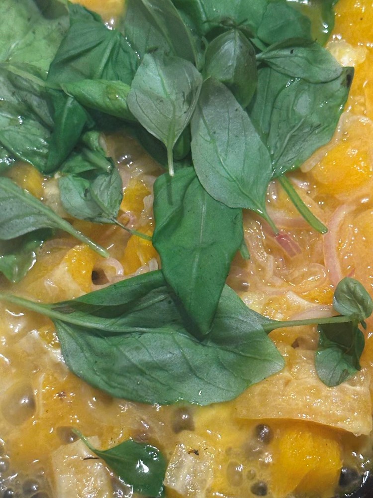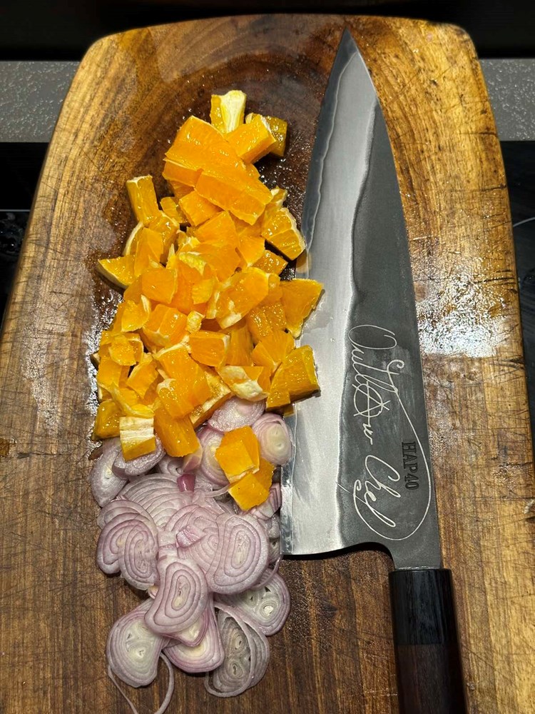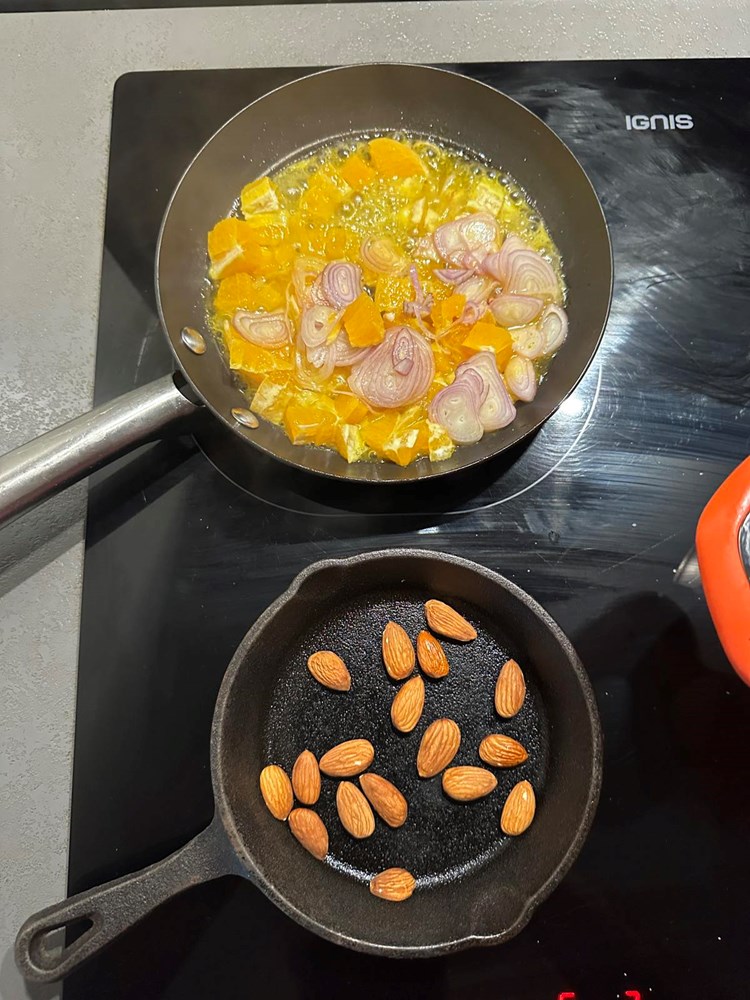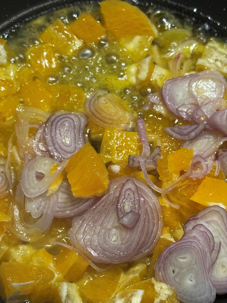 Oštrim kuhinjskim nožem izrežite naranču na kockice, a luk ljutiku na tanke kolutiće. U tavu na srednje jakoj vatri na zagrijanome maslinovom ulju stavite pržiti luk ljutiku i naranču koju ste narezali na kockice. Nakon par minuta prženja kada se naranča i luk ljutika stope u jednu kompaktnu gustu masu dodajte cca 7 sviježih listova bosiljka, pola čajne žličice ljute soli i pržite ih još nekih 60 sekundi pa maknite s izvora topline.