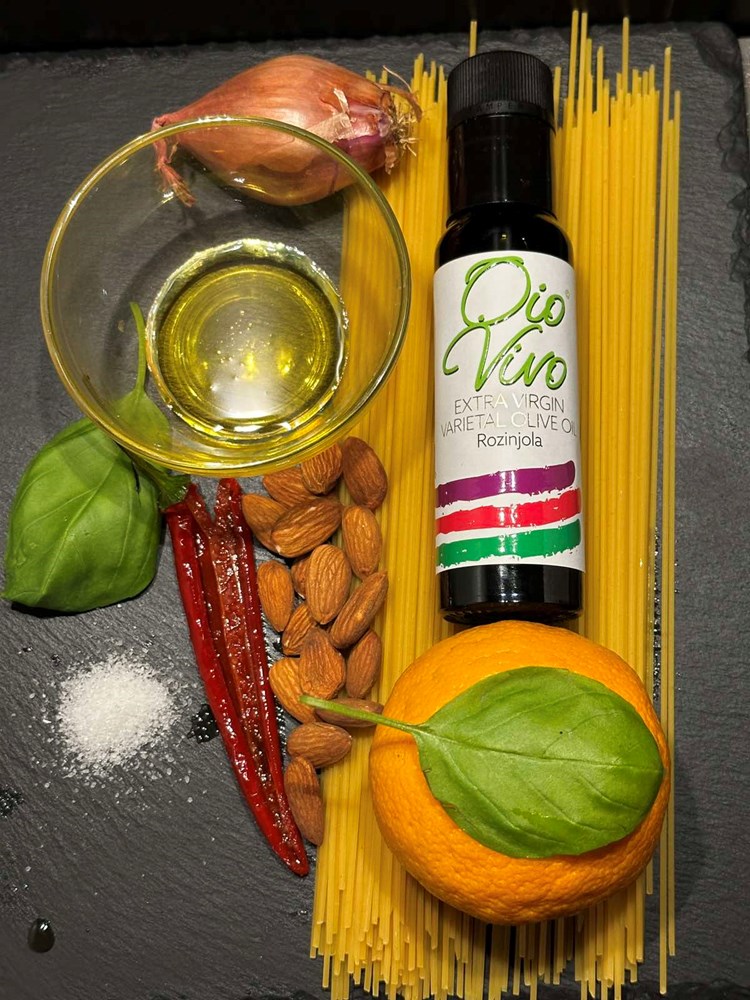 Nakon tri dana izvadite jedan feferon iz teglice i maslinova ulja, razrežite ga na trakice i nek čeka kraj izvedbe ovog jela… Njegova je uloga ključna, dok aromatizirano ulje iz staklenke (jednu jušnu žlicu) možete koristiti u ovom jelu dok pravite šalšu od naranče i nekoliko kapi za kuhanje spaghetta u slanoj vodi.