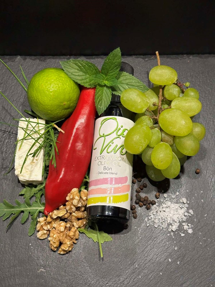 Sve ovo začinite s jednom jušnom žlicom maslinovog ulja i iscijeđenim sokom od limete i prstohvat cvijeta morske soli… Sve lagano izmiješajte i uživajte u laganim slatkasto kiselkastim osvježavajućim okusima koji se međusobno sljubljuju dok blaga ljutina friško zdrobljenog crnog papra u kombinaciji s maslinovim uljem i sokom limete "vaše nepce održavaju u laganim plamenu", a lagana gorkasta eterika oraha daje vam cjelodnevnu energiju…