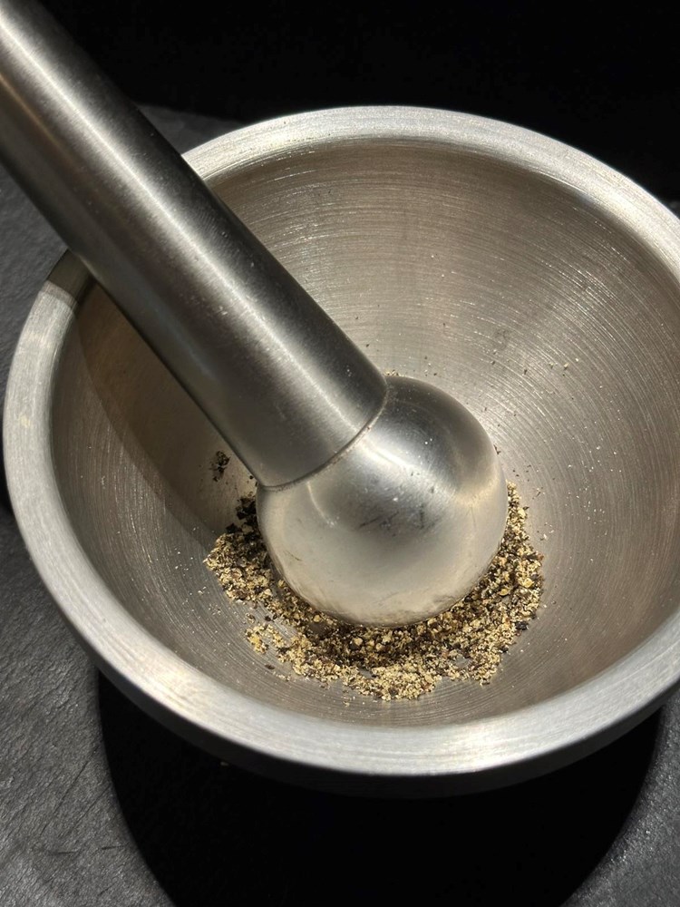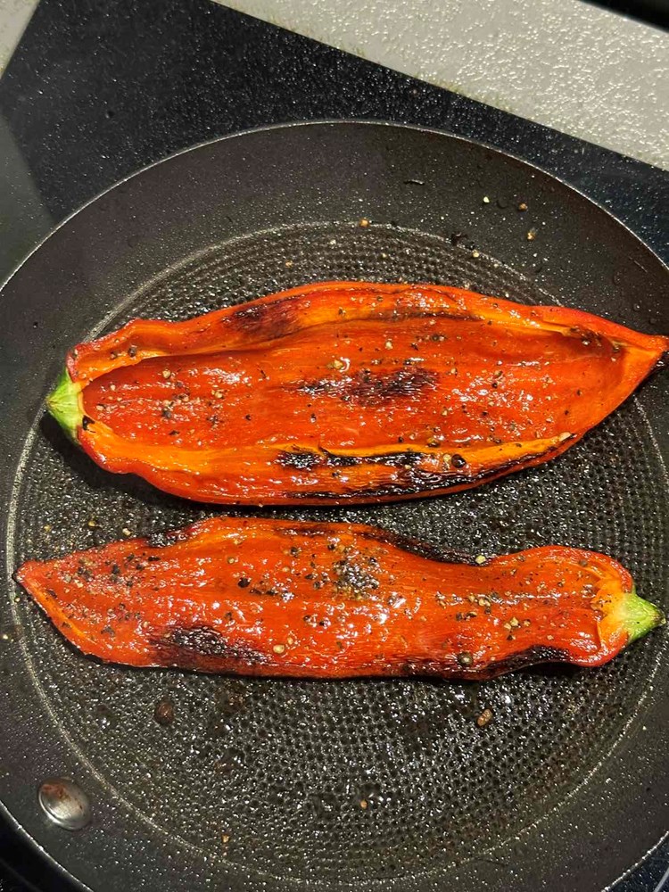 Na vrelu tavu s par kapi maslinovog ulja pecite polovice paprike. Nakon par minuta prženja dodajte dva prstohvata papra kojeg ste friško samljeli u mužaru na krupno ili mlincu za papar. Papriku pecite sve dok s obje strane ne dobije mjestimice tamne mrlje.