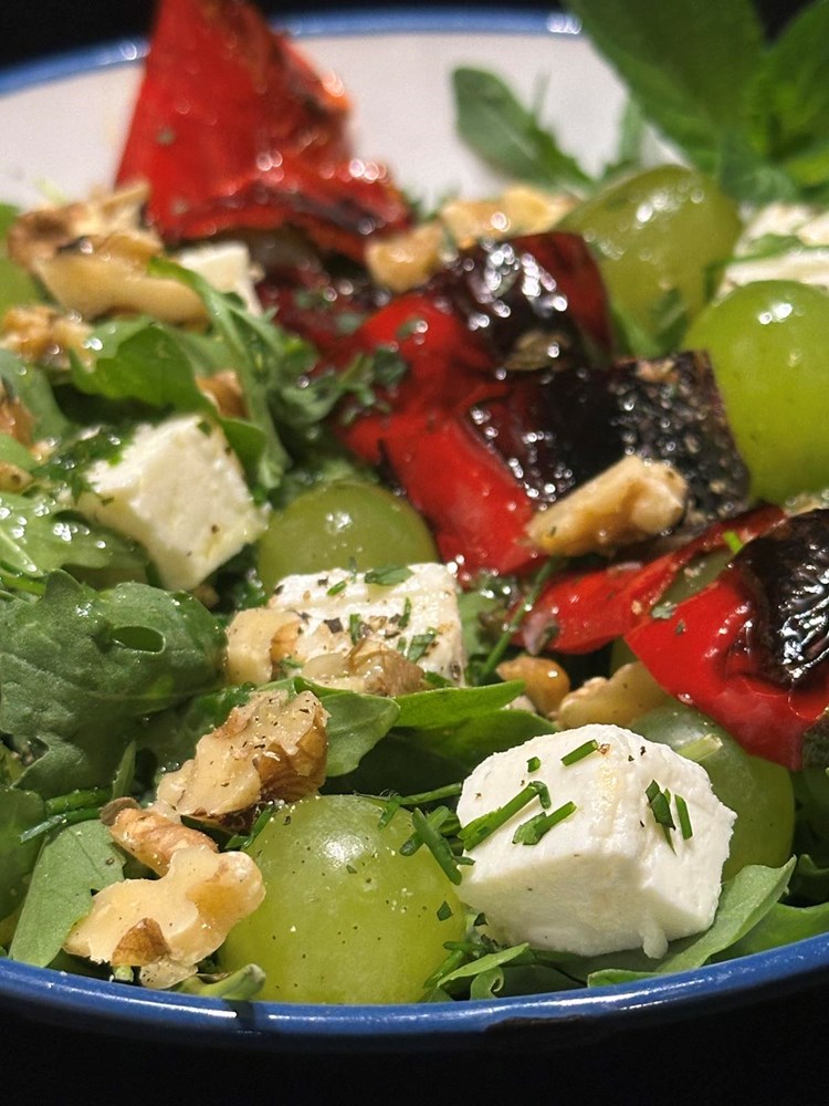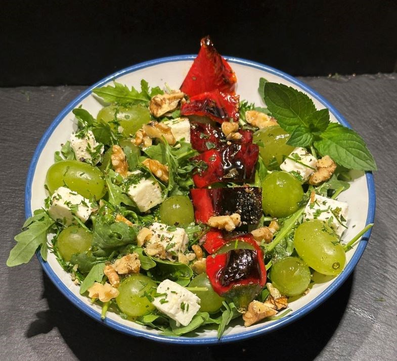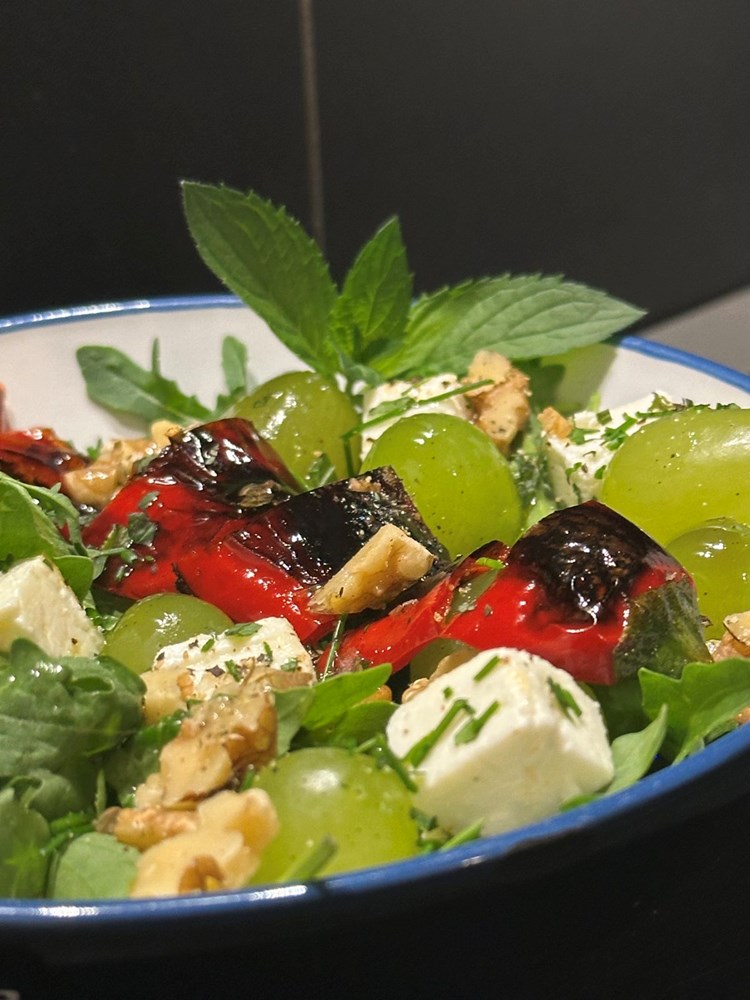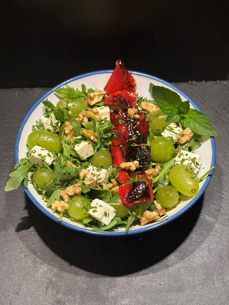 U manju zdjelu stavite šaku svježe rokule, bobice grožđa, grčki slani feta sir kojeg ste izrezali na kockice, jezgru oraha izrezanu na komadiće, usitnjeni lik vlasac i mentu, trakice pržene crvene slatke paprike .