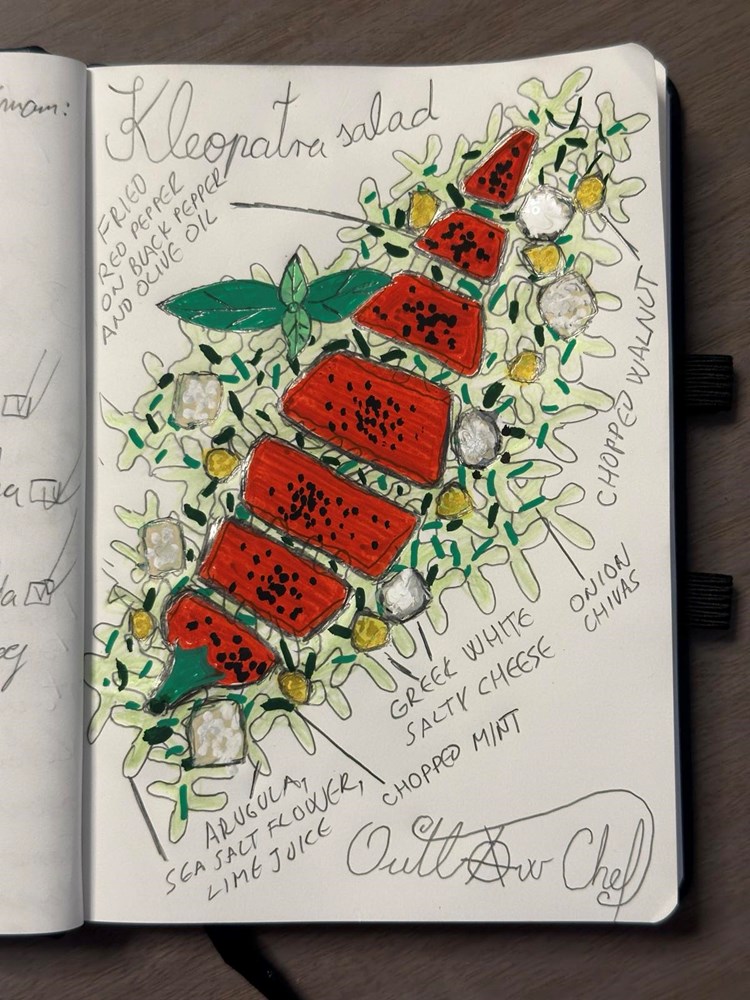 Jako je lijep kuharski dan… Ja sa svojim kolegama na Velom Brijunu u kuhinji na plaži Saluga odrađujem narudžbe - jela, od gostiju i svi se dobro zabavljamo pritom…. I tako uleti Saša konobar i kaže: "Pa šta je ovo svako malo neka Cezar salata, a gdje je Kleopatra ?!" I onda mi je sinulo, poput kuglaste munje što para ranojutarnji proljetni zrak, tu dolje odmah iznad morske pučine… zašto ne bih izmislio, napravio i kreirao zaista "Kleopatra salatu". . .