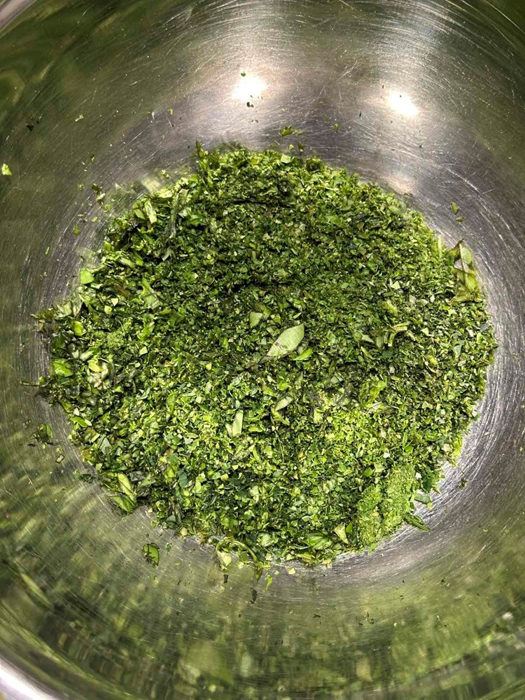 1) Navedene listove u sastojcima oštrim nožem nasjeckajte na što sitnije, baš kao da sjeckate peršin.