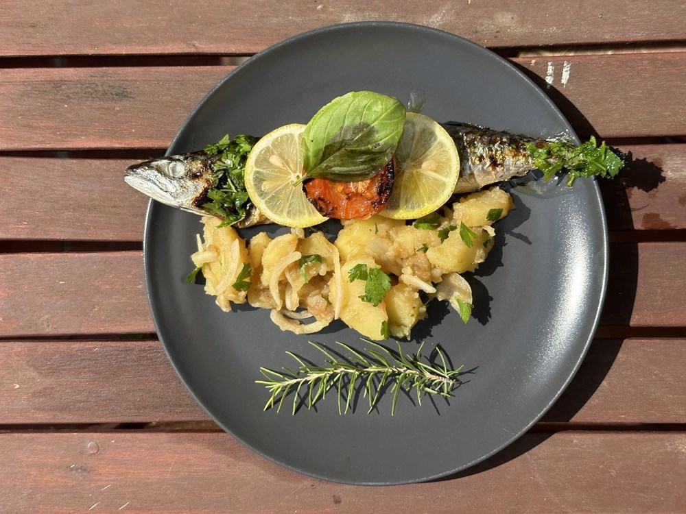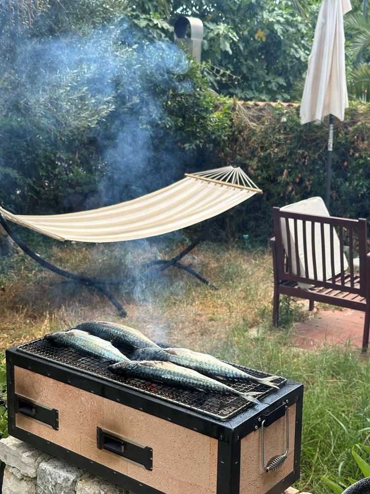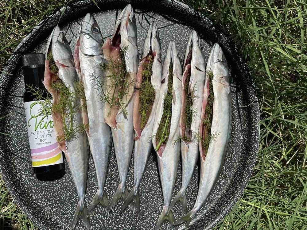 Dakle riba koja mi sada pada na pamet je “škombra”, moćna plava riba bogatog okusa koja na svojoj koži bez ljuske sadržava upravo sve ove boje i tonove. I ja odmah tu, uz svoju kuću posjedujem malen vrt. Imam u njemu i maslinu, a to znači da ću uz ovu ribu upotrijebiti i maslinovo ulje. Odmah tu na lijevo od stražnjih vrata sobe s velikim kaučem i još većim TV-om, ili ti prostorijom za “svakodnevno buljenje u prazno” - raste pomidor i bosiljak, njega ću također staviti na žar.