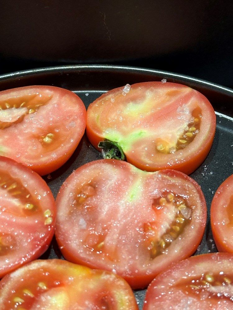 Nakon što ste maknuli ribu sa žara na gradele položite pomidor narezan na ploške koji ste lagani posolili i poprskali maslinovim uljem. Pecite ga cca 2 minute sa svake strane. Na onu stranu koja je već pečena stavite po jedan svježi listić bosiljka. Po isteku one 2 minute maknite pomidor s vatre.