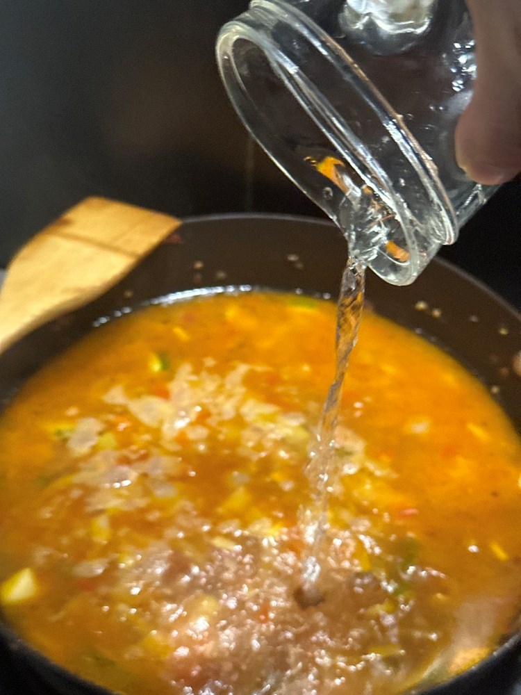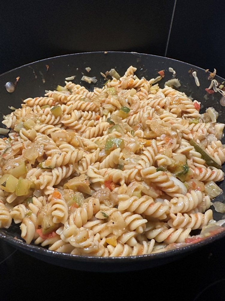 Nakon 4 do 5 minuta laganog miješanja i prženja gore navedenog povrća na tavi, pojačajte temperaturu na srednje jaku i dodajte jedan dec vode, miješajte i dalje. Nakon par minuta što ste dodali vodu, dodajte još dec i pol vode i nakon minutu ili dvije, kad naš sadržaj tave ponovo zakipi dodajte šaku i pol tjestenine fusilli (dodajte sirovu, ne skuhanu tjesteninu, direktno u šalšu - ona će se skuhati u šalši i na ovaj način biti ukusnija i kompaktnija).