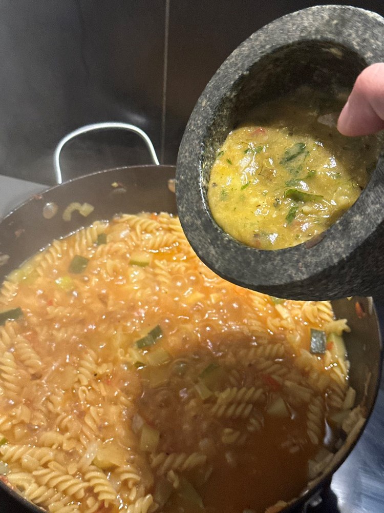 Nakon desetak minuta dodajte naš sadržaj iz mužara u tavu, zatim miješajte još minutu i pol, dije pa maknite tavu s izvora topline.