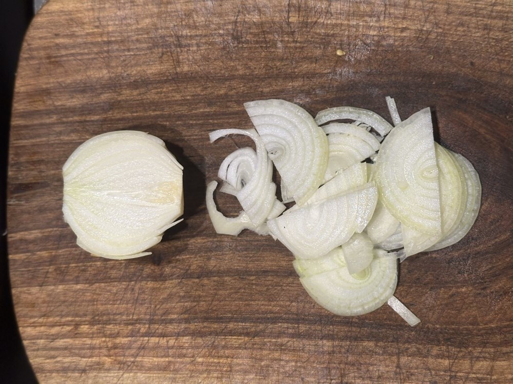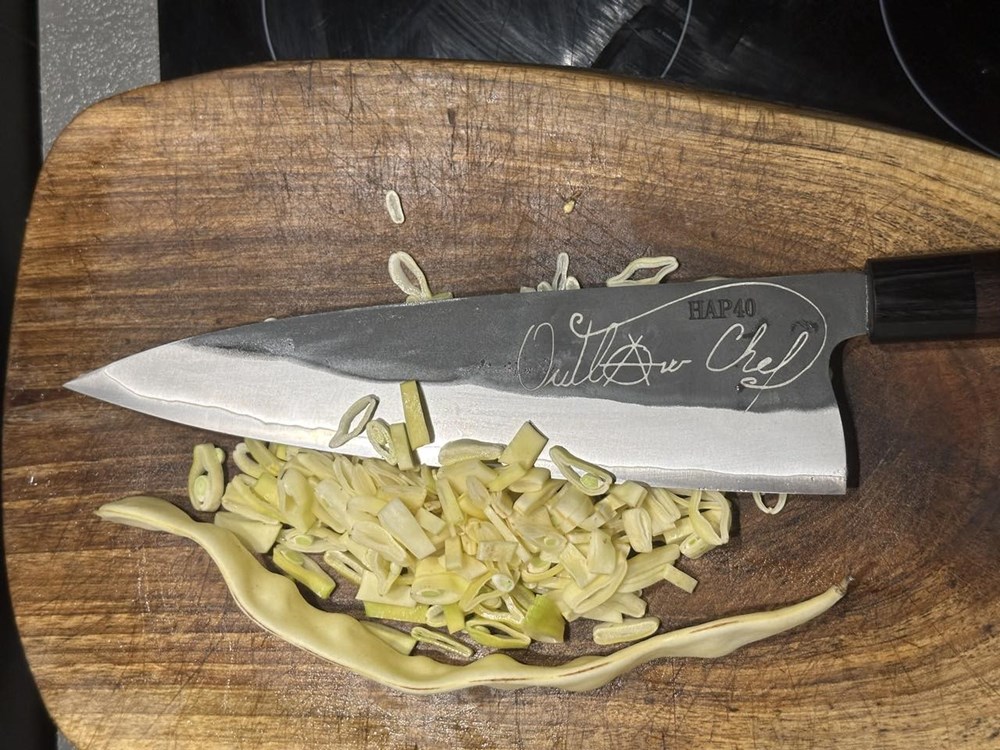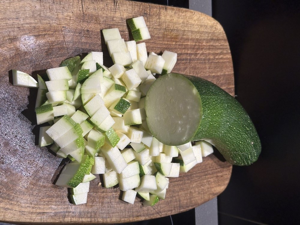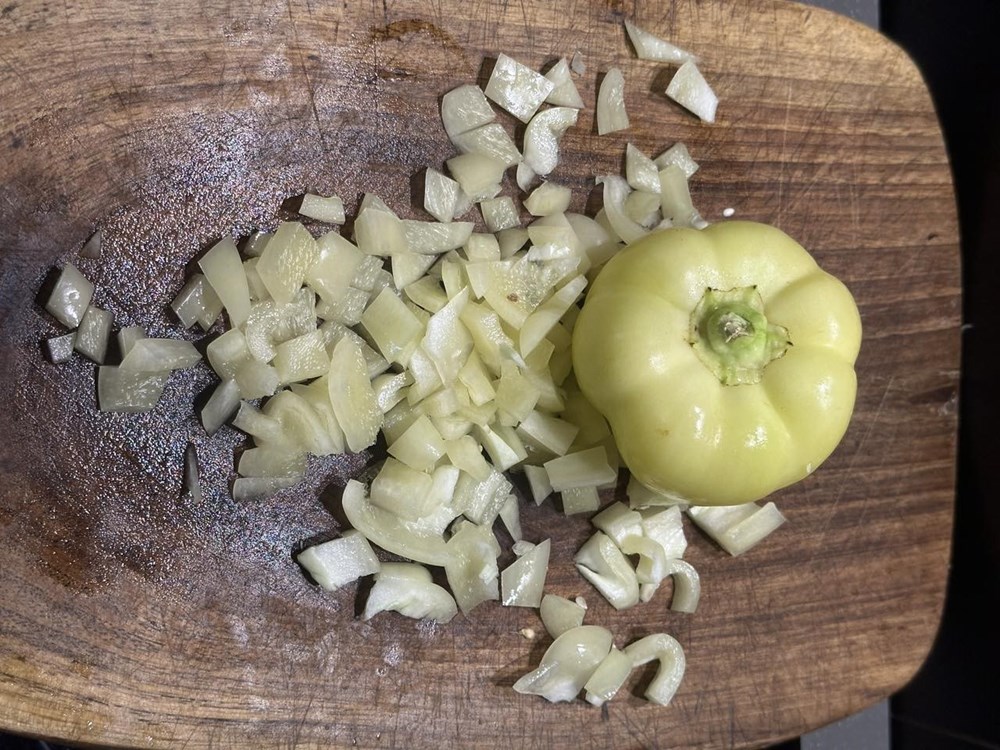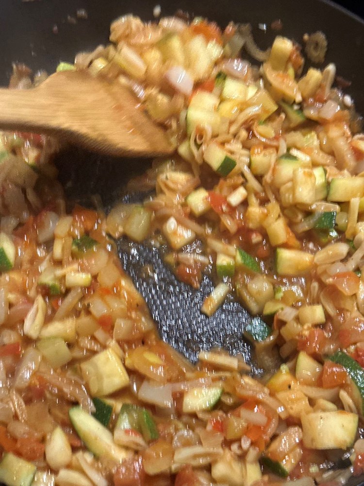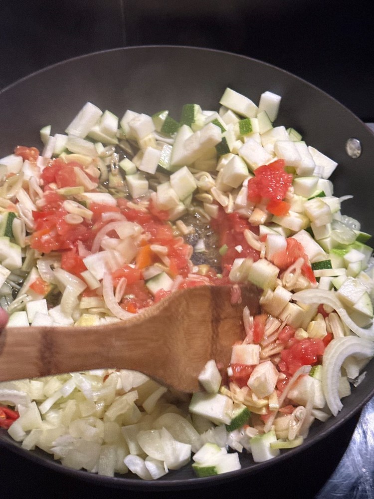 Velikim oštrim kujinjskim nožem usitnite pomidor na što sitnije komadiče. Narežite žutu mahunu na tanke kolutiće, zatim izrežite pola glavice luka na tanke trakice. Nakon toga izrežite pola stabljike celera na ranke kolitiće, a onda i papriku na male kockice veličine graška. Tikvicu možete izrezati na kockice nešto veće od velićine graška. Navedene sastojke ubacite u tavu na zagrijano maslinovo ulje na laganoj vatri i pomalo miješajte.