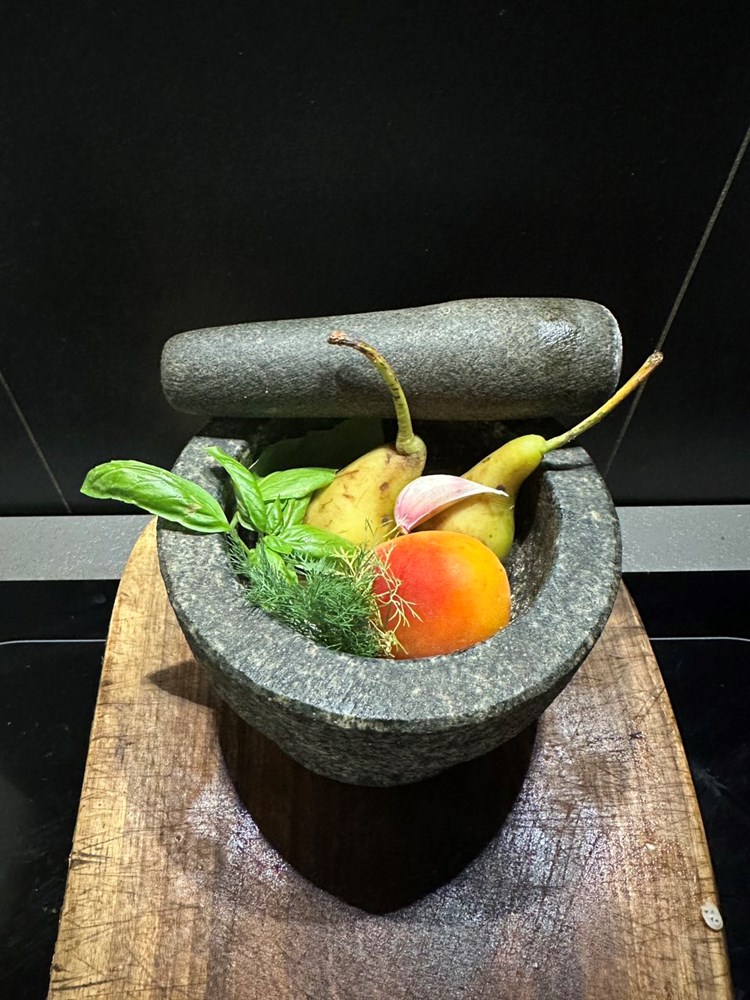 U kameni mužar stavite cca 15 dkg zrele kruške očiščene bez koštica i peteljki, jednu zrelu marelicu bez košćice, 5 listova bosiljka, dvije grančice kopra, zrno zdrobljenog češnjaka, pola čajne žličice cvijeta morske soli, trećinu čajne žličice crnog friško samljevenog papra, pola jušne žlice meda i jednu jušnu žlicu maslinovog ulja.