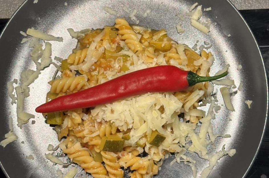 Na veliki ravan tanjur, servirnom žlicim stavite fusille s umakom iz tave. Po fusillima i umaku naribajte ribežom na krupno otprilike 5-7 dkg tvrdog ovčjeg sira. Povrh svega stavite jedan crveni ljuti feferon. On je bitan jer će zaokružiti cijelu ovu slankasto, slatkastu osvježavajuću priču.