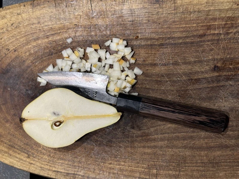 Trećinu svježe zrele kruške izrežite na sitne kockice (manje od zrna graška).